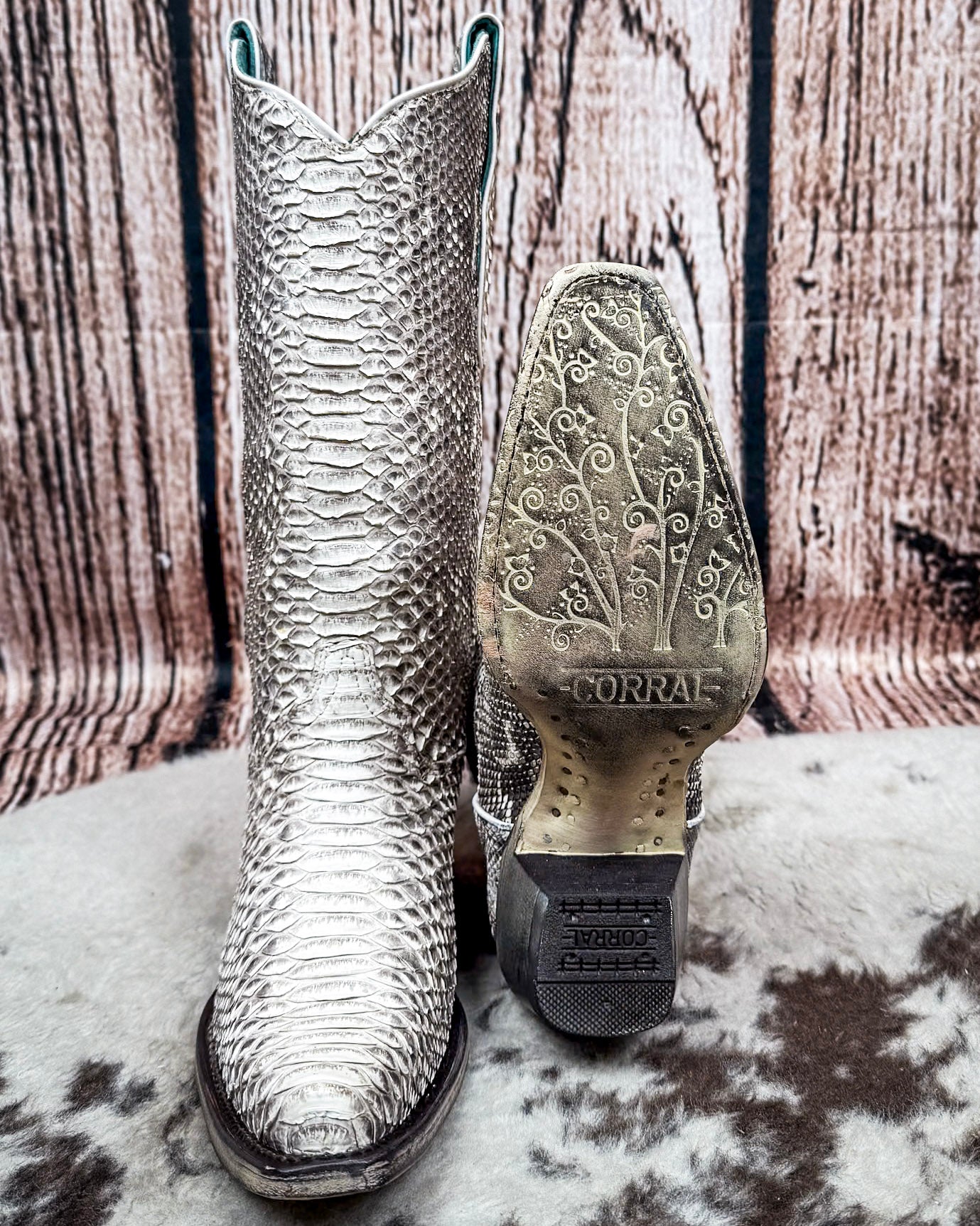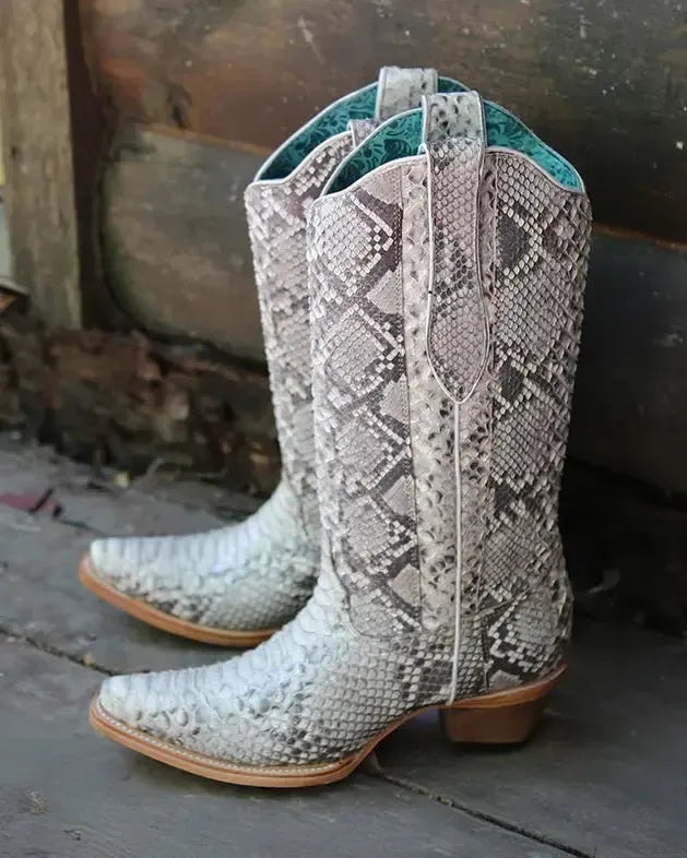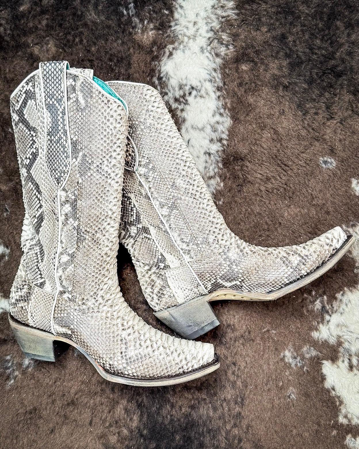 Sharp, sleek, and impossible to ignore—the High Noon Hiss Boots by Corral are made for the bold. Handcrafted from genuine python leather, these tall boots bring serious attitude with their natural scale texture and head-turning silhouette. The 13" shaft and snip toe create that classic western shape, while the exotic leather does all the talking.