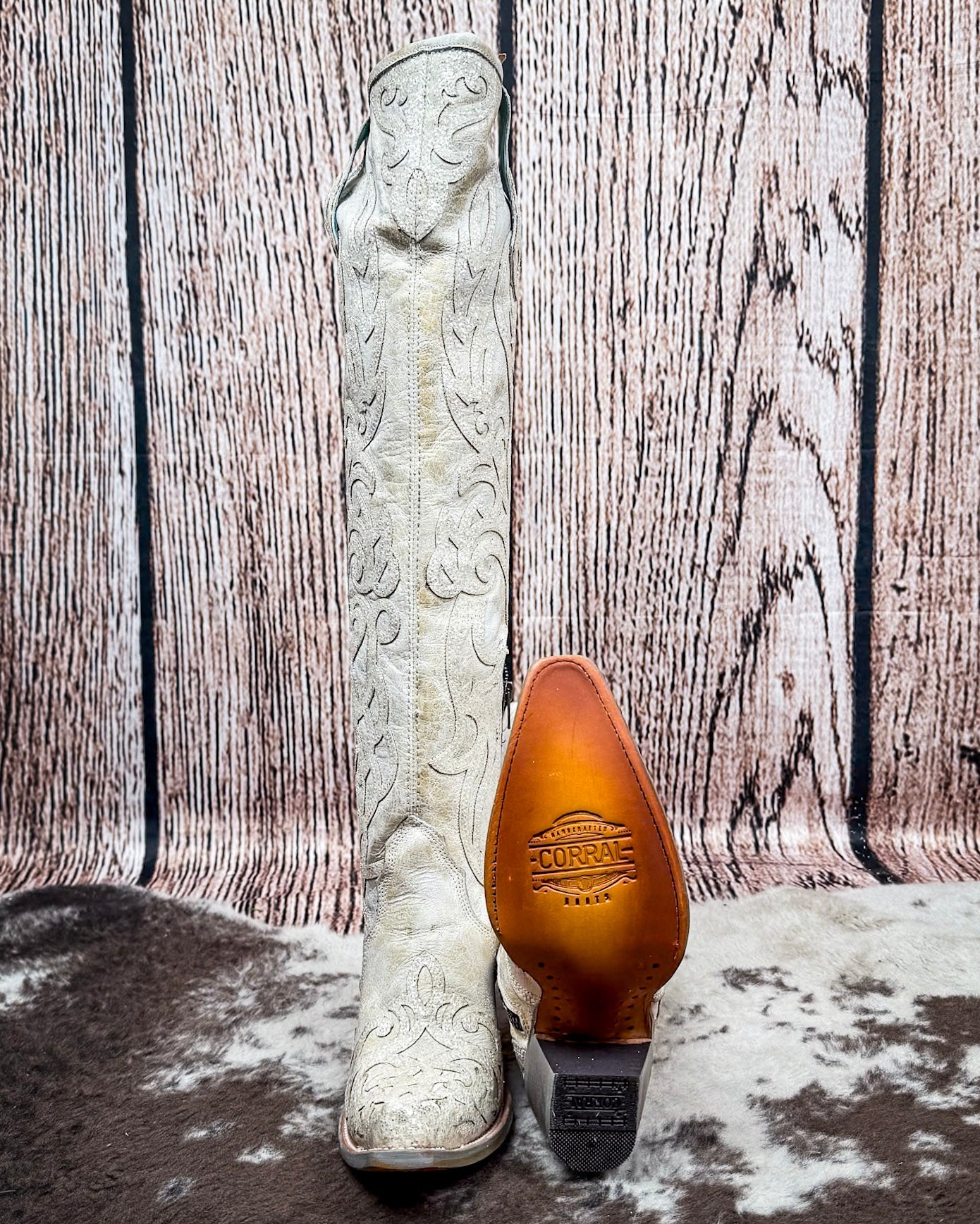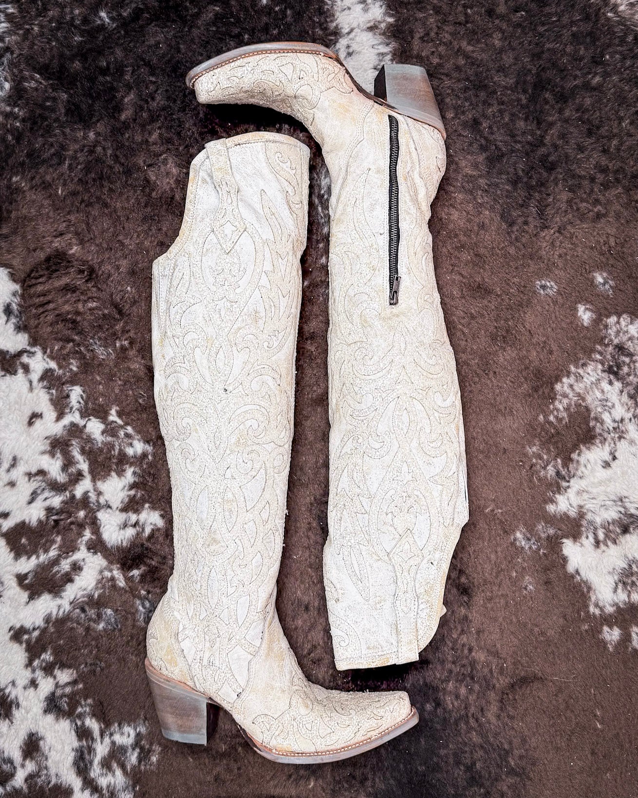 Graceful with a little glam—the Prairie Pearl Boots by Corral are tall, striking, and designed to make an entrance. With a dreamy 22" shaft and a soft beige finish, these boots bring elevated western style to life. The intricate detailing is laced with glittered overlays that catch the light just right, adding sparkle without stealing the show.