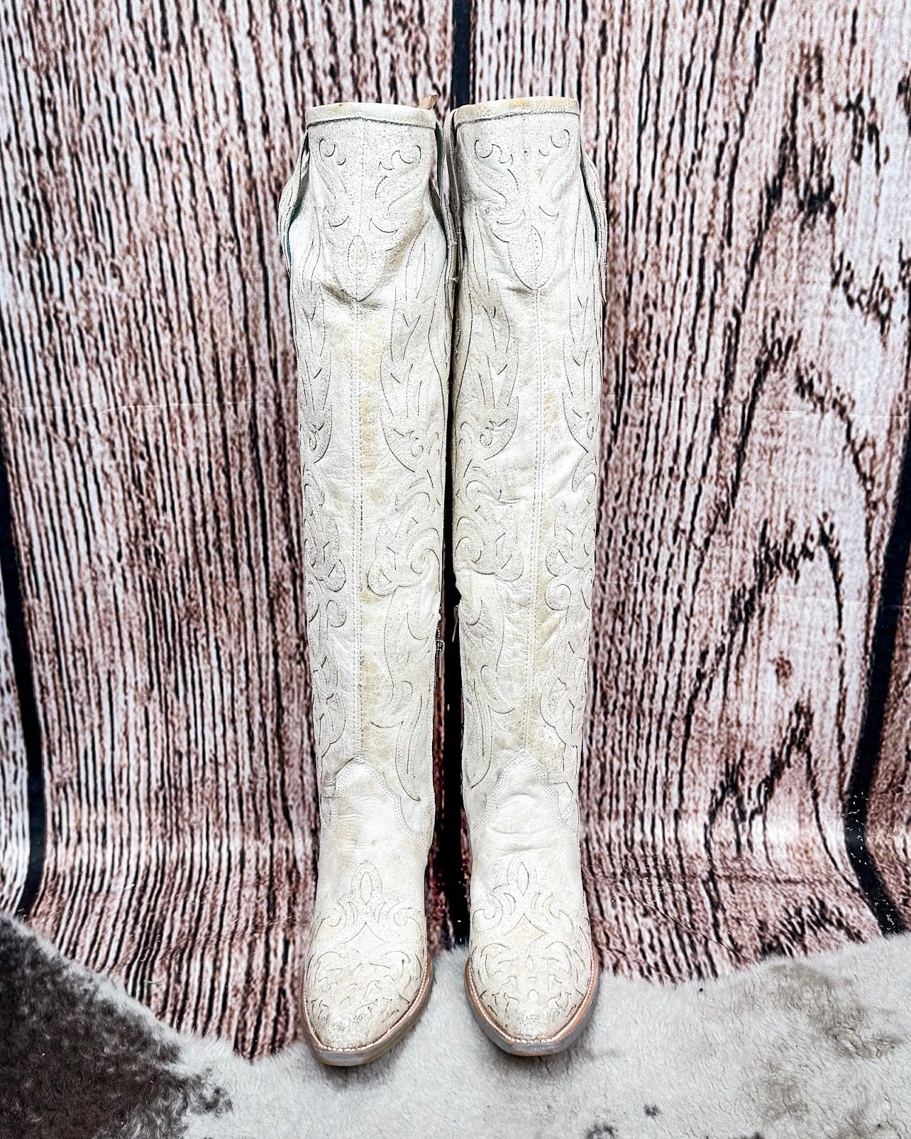 Corral + Circle G boots ship directly from the manufacturer, so please allow 7–14 business days for your order to hit the road. Good things take time—and trust us, these boots are worth it. These boots ship from the maker and must go to a physical address. No PO Boxes, please!Graceful with a little glam—the Prairie Pearl Boots by Corral are tall, striking, and designed to make an entrance. With a dreamy 22" shaft and a soft beige finish, these boots bring elevated western style to life. The intricate detailing is laced with glittered overlays that catch the light just right, adding sparkle without stealing the show.