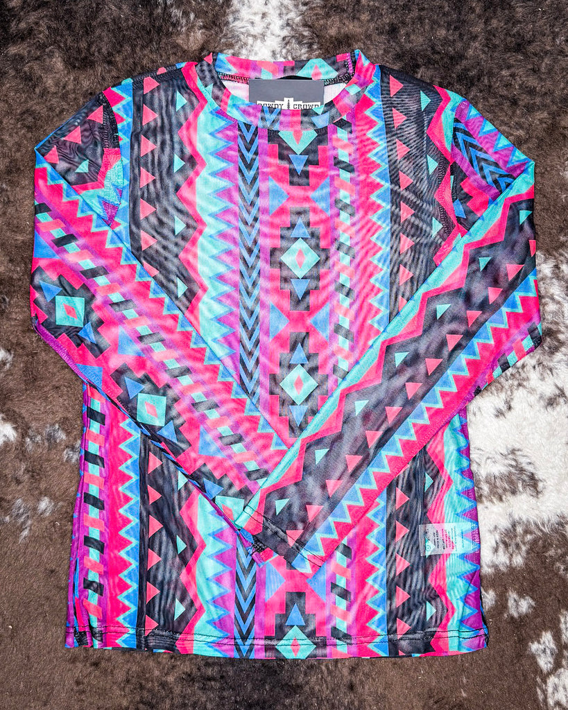 The moment you see it, you know it’s special. A kaleidoscope of pink, purple, and turquoise dances across the fabric in an intricate Southwestern-inspired pattern. Geometric shapes play alongside jagged lines and stacked diamonds, giving off retro rodeo poster vibes with a modern twist. The colors are rich without being overpowering, making it surprisingly versatile for mixing and matching with your existing wardrobe. Whether you’re headed to a concert, an art market, or just your favorite coffee spot, the Retro Funk Mesh Top is going to start conversations.