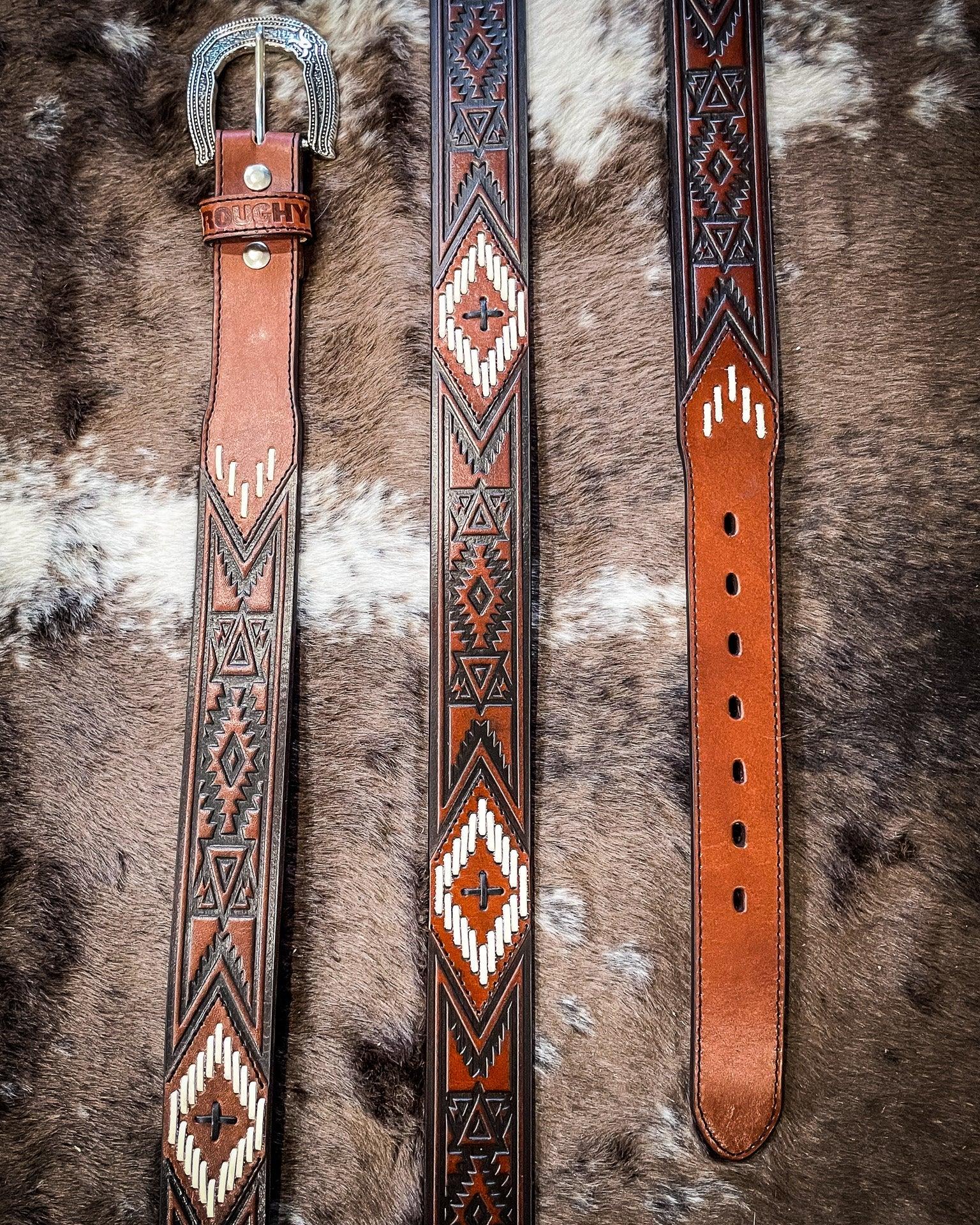 This roughy original men's belt features brown leather, with black aztec embossed, detailed hand-laced ivory & blue accents.