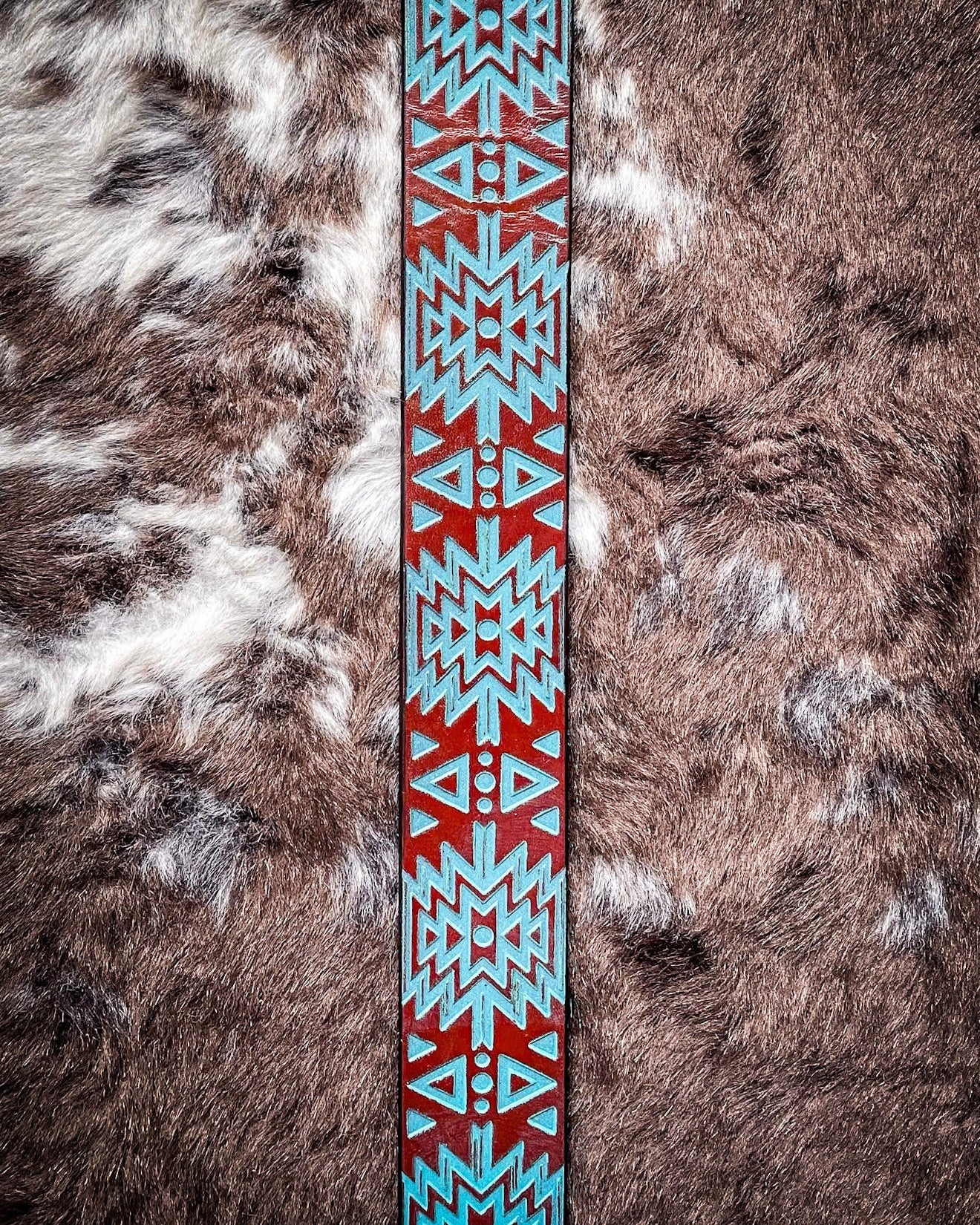 This Hooey original ladies belt features brown with turquoise aztec embossed leather and has a detailed small rodeo thunderbird buckle with faux turquoise stone.