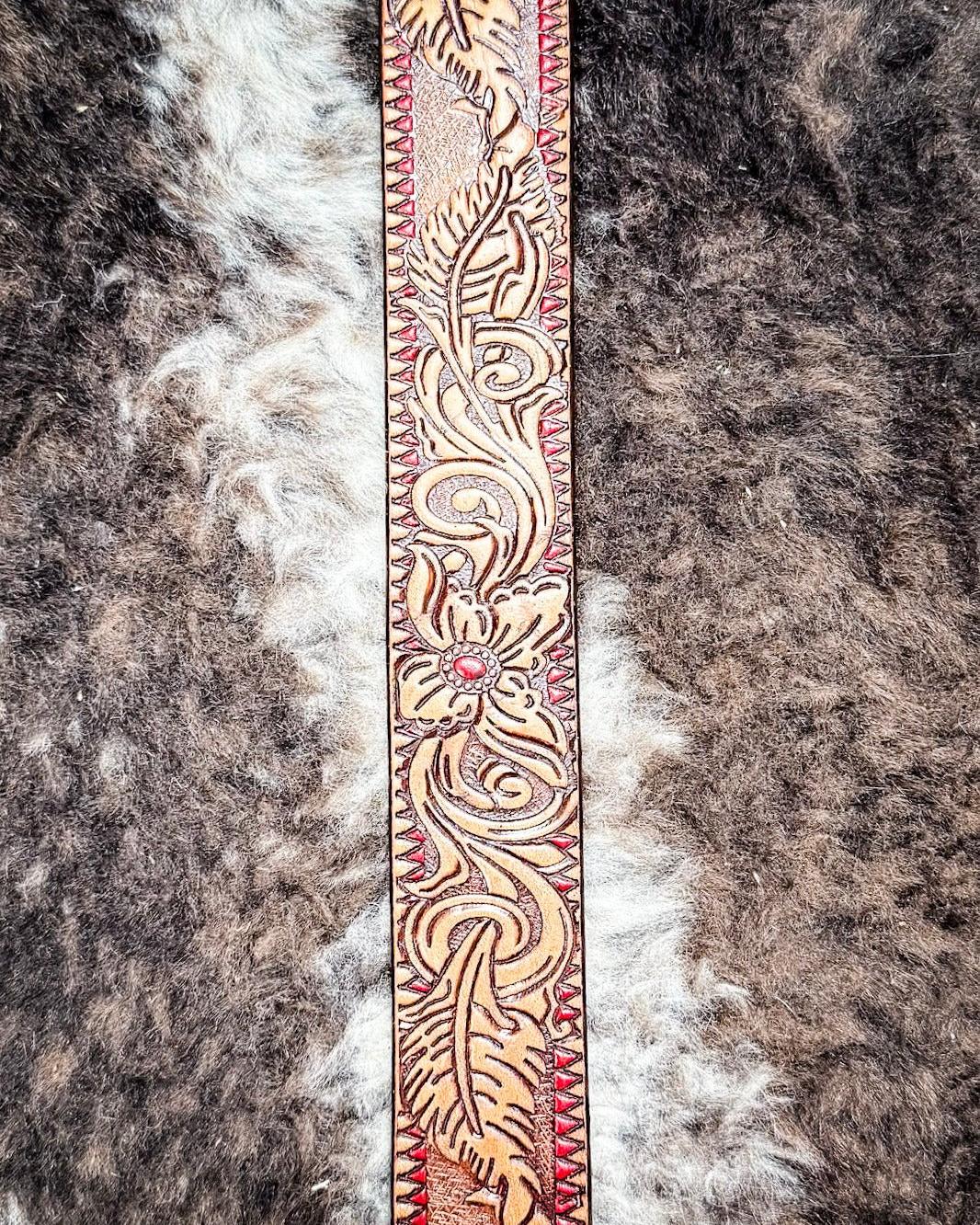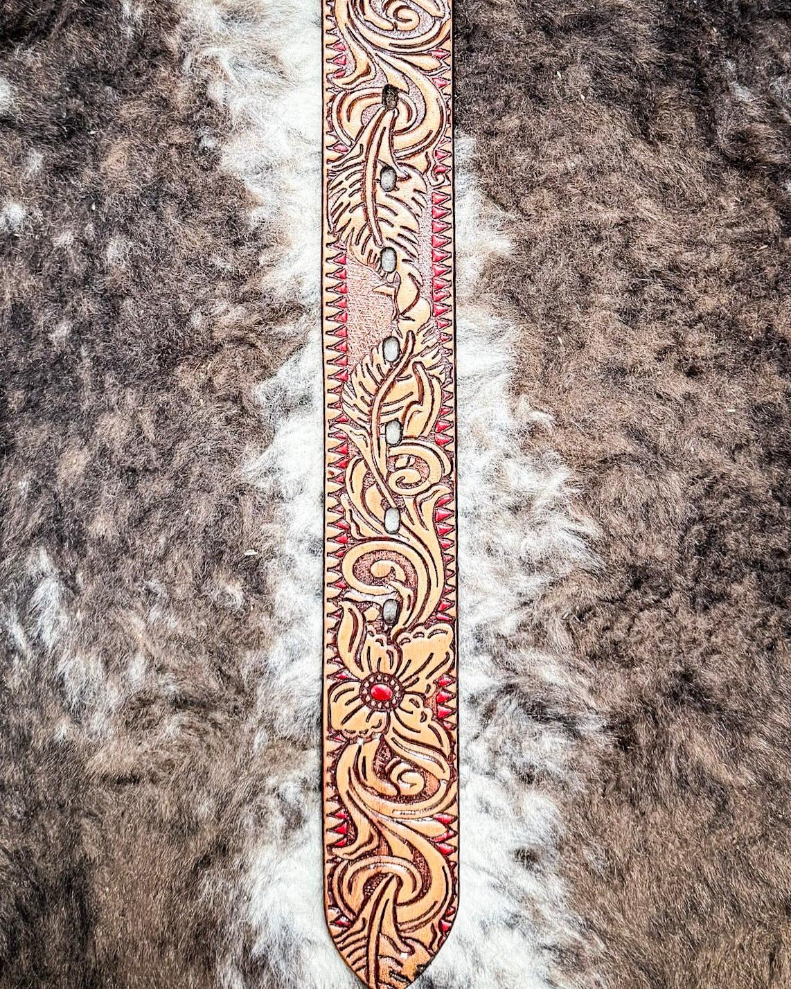 Crafted from genuine natural leather, the Flora features a striking feather and floral filigree design, beautifully embossed and finished with rich red hand-painted accents. The mix of natural tones and deep red gives it a look that's earthy, elegant, and full of life — just like the women who wear it. Each belt is heat branded and hand painted, making every piece a little different and a whole lot special. It’s got that handcrafted feel you just can’t fake.