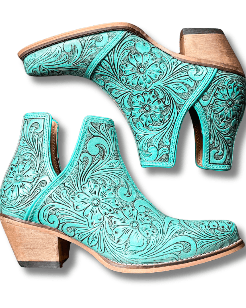 • Bring bold color and timeless craftsmanship to your wardrobe with the Myra High Mesa Booties in Turquoise. Crafted from genuine leather and hand-tooled with an intricate floral desert blossom design, these boots are as unique as they are eye-catching.