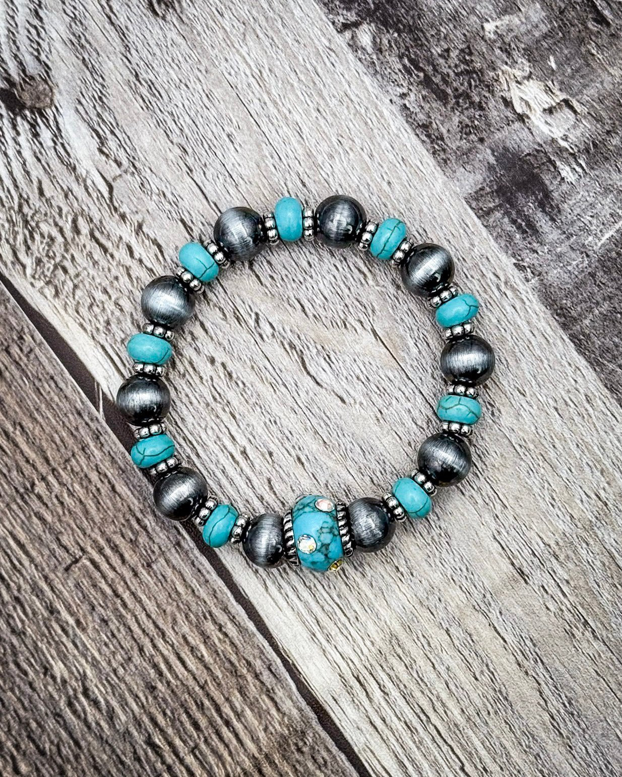 • Channel the spirit of the Southwest with the Wild Bloom Beaded Stretch Bracelet. This handcrafted piece features a stunning mix of turquoise colored and gunmetal marbled beads, accented with silver toned spacer details for a polished Western finish. The stretchy, comfortable fit makes it perfect for everyday wear—whether you’re heading to a rodeo, a weekend market, or just adding a hint of rustic elegance to your outfit.
