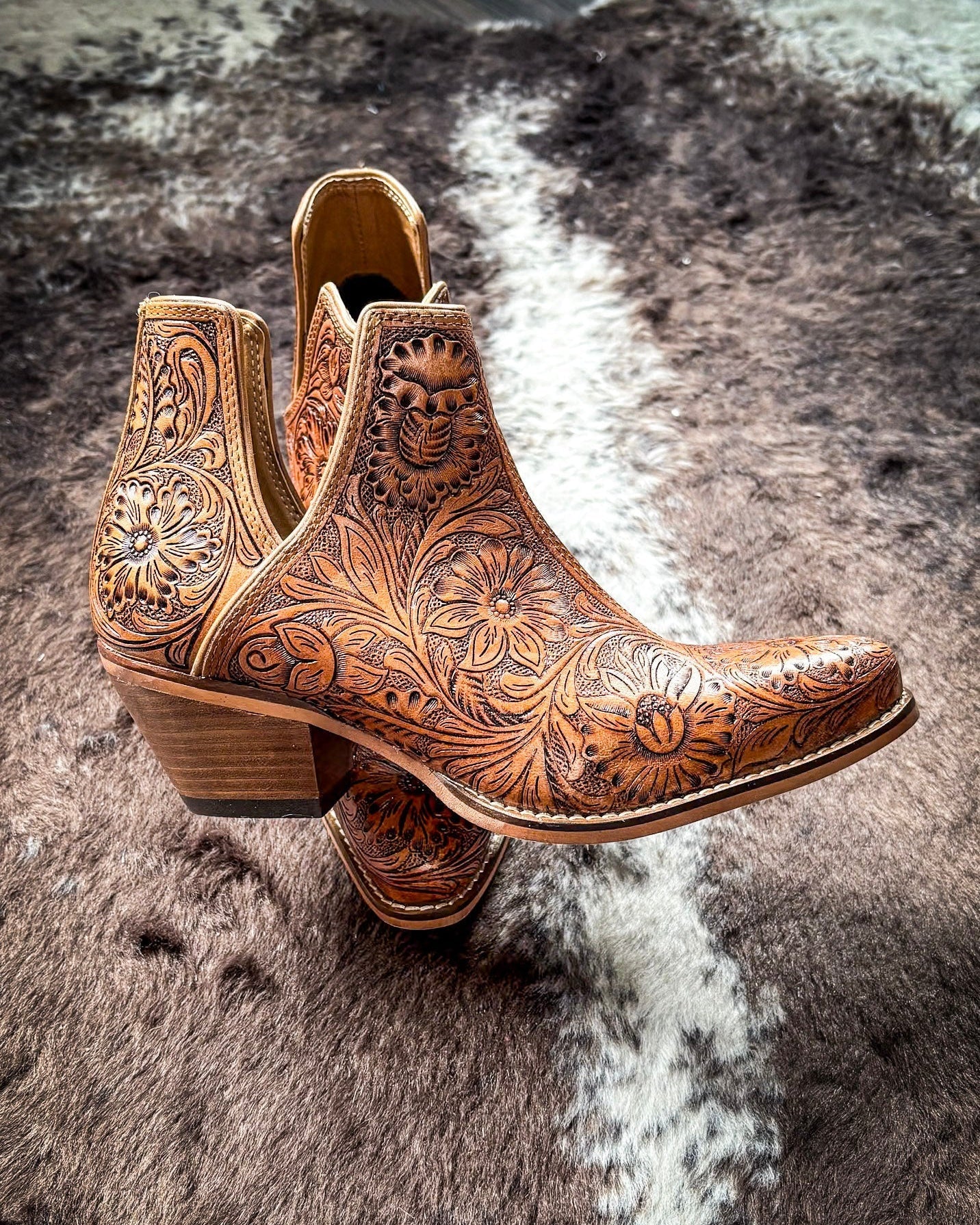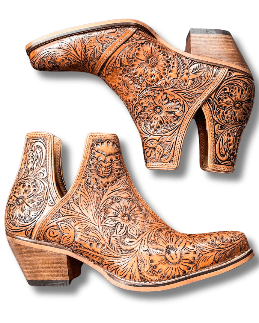 Crafted for the ones who like their style with a little story behind it, the Dakota Charm Booties in Caramel are all about that hand-tooled leather magic. Each pair is etched with desert blossom details that feel both vintage and fresh—bringing a touch of western romance to every outfit. With warm caramel tones and classic cowboy heels, these booties are the perfect blend of heritage and modern charm.
