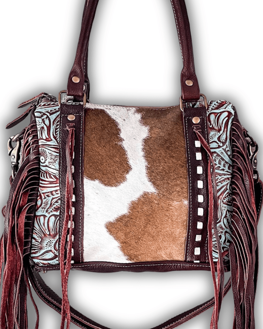 At the heart of this design is genuine hair-on-hide, framed by warm leather tones and turquoise-tooled side panels that give off an earthy, sun-washed energy. The hide front is completely unique from one bag to the next, adding a natural, grounded touch that feels raw and real. Long, rich brown fringe spills down each side, adding movement and drama in every step.