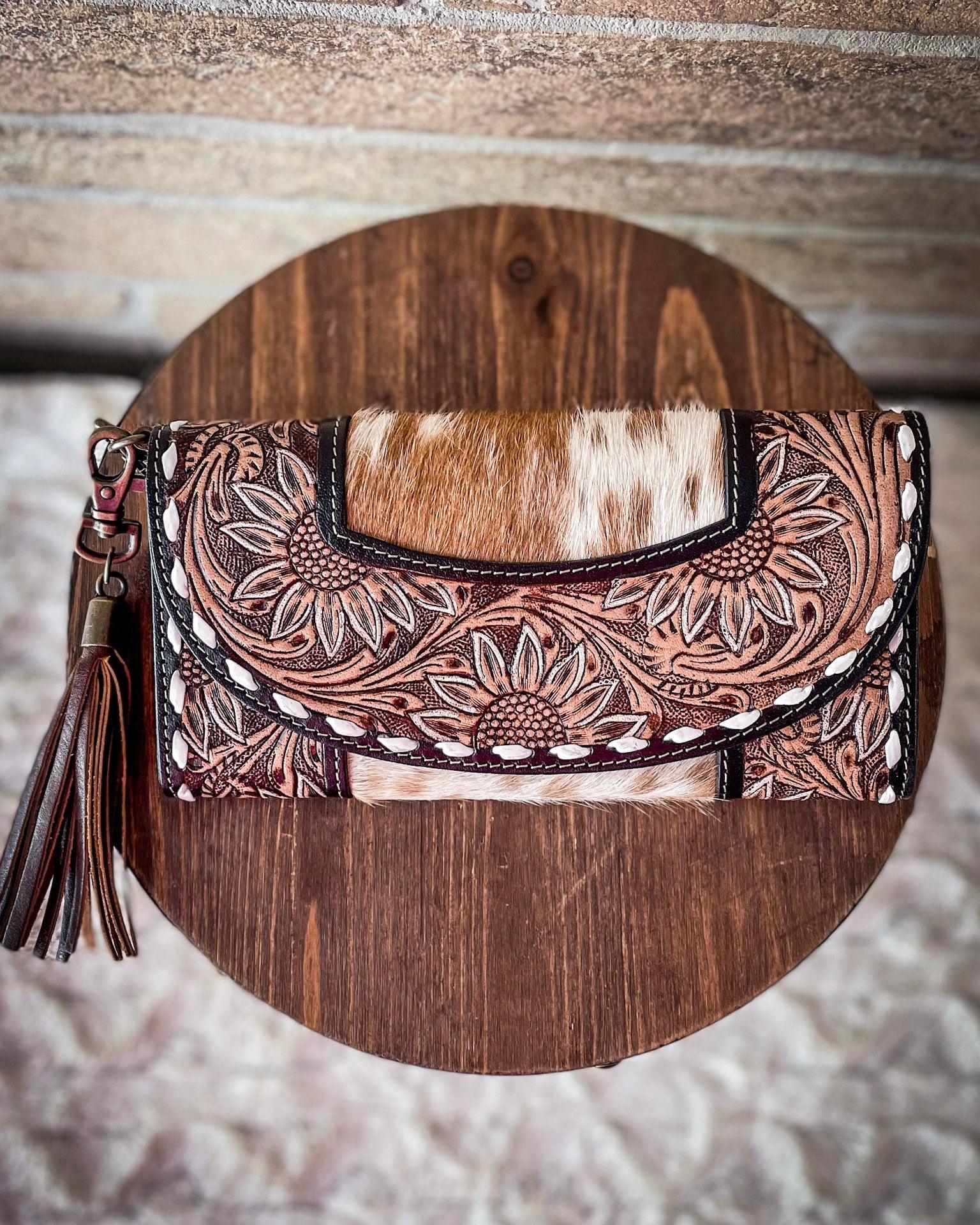 The front flap features intricate tooled blooms, paired with natural hide for a unique, eye-catching look. A snap-close flap keeps your essentials secure, while the interior offers multiple sections, including a zippered pocket for coins or small items.