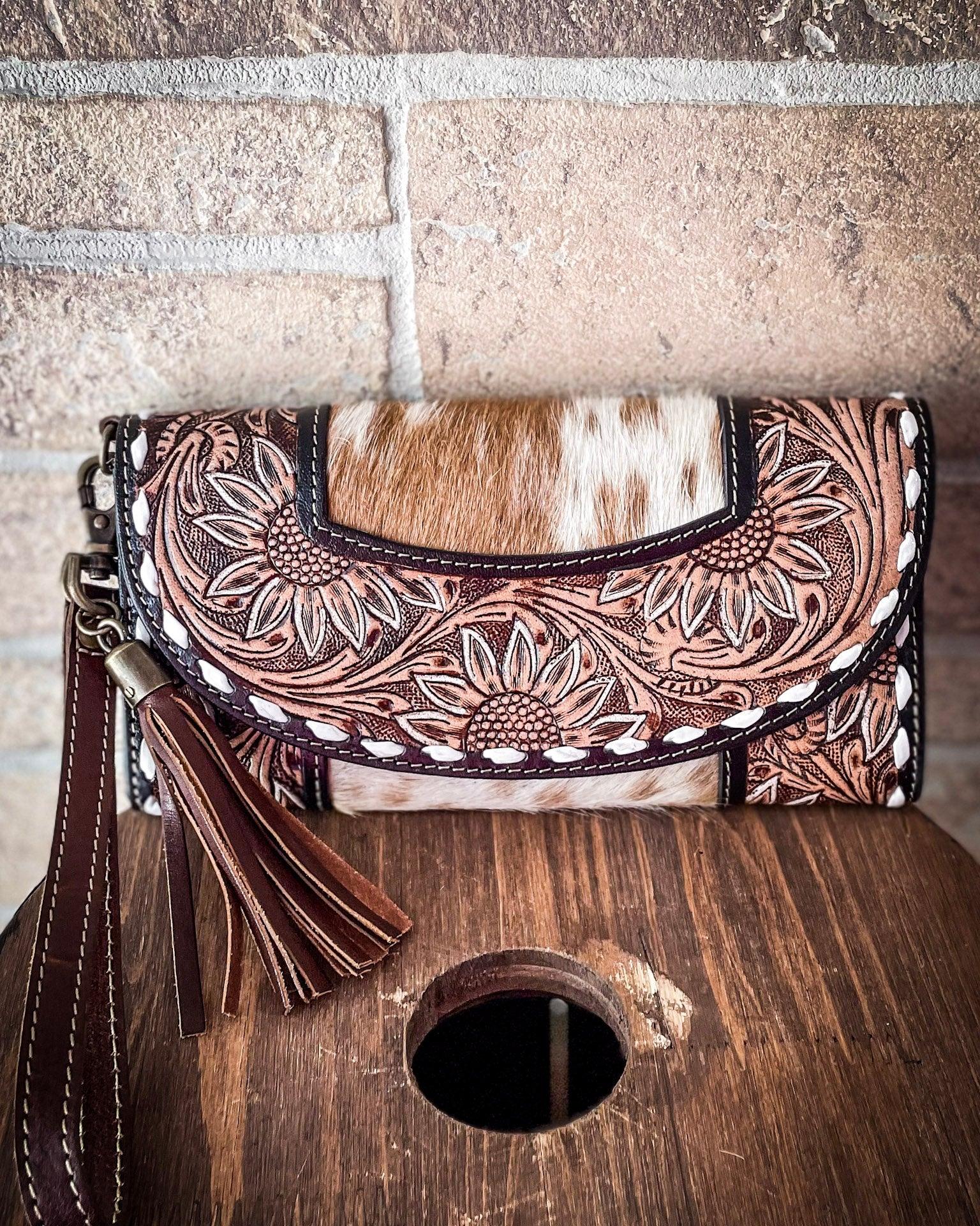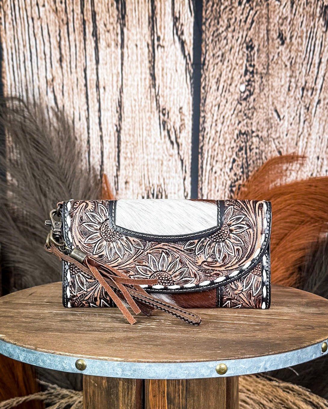 Rustic elegance meets everyday function in the Myra Sandstone Trail Hand-Tooled Wristlet Wallet. With its floral hand-tooled leather and genuine hair-on hide, this piece is both practical and one of a kind.