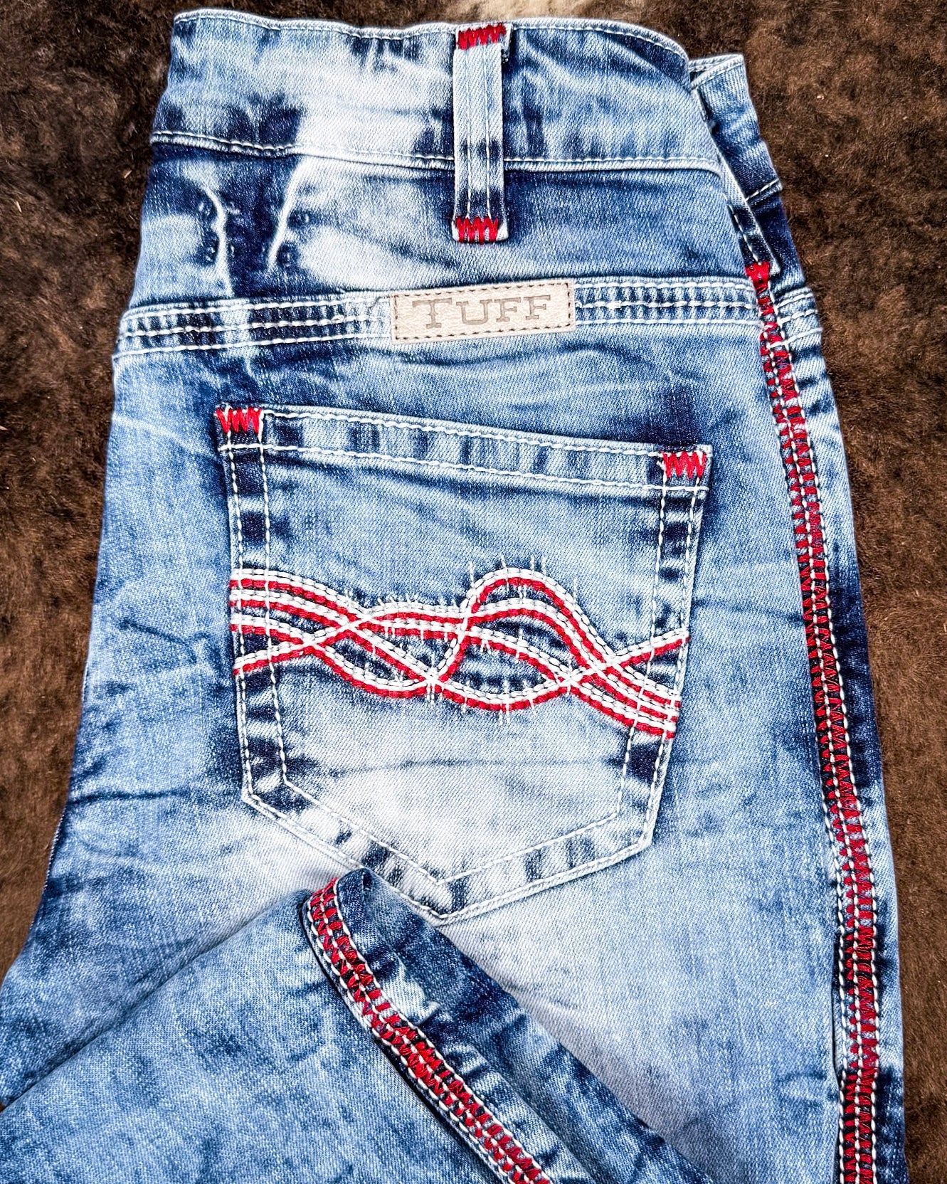 Now let’s talk about that wash. The unique crinkle finish gives these jeans major texture and a vintage-inspired, worn-in vibe that’s guaranteed to turn heads. The overall white and red thick contrast stitching brings the look to life, adding a bold, eye-catching pop from waist to hem. And the back pockets? Detailed with Cowgirl Tuff’s signature freedom wave embroidery, they’re the perfect finishing touch.