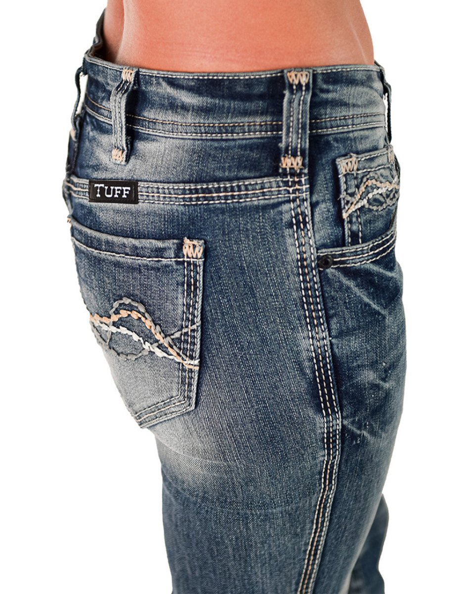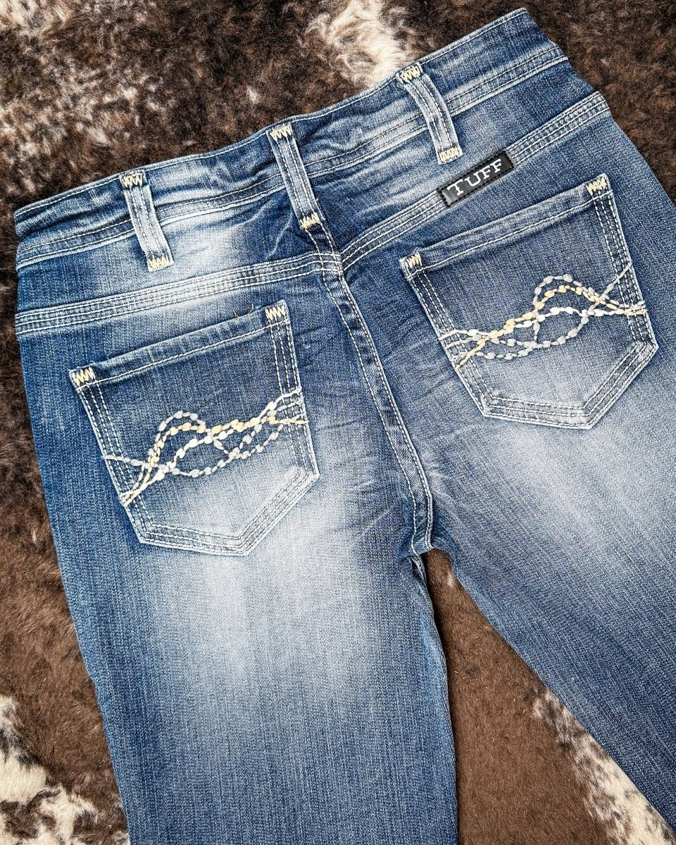 Detailed with cream, tan, and gray triple-stitching, these jeans hold up beautifully to long days in the saddle, the arena, or on the go. The low-stretch cotton blend stays true to Cowgirl Tuff’s legendary durability and classic structure, offering a snug yet comfortable mid-rise fit that flatters in all the right places. Finished with wave-stitched back pockets and subtle contrast details, they bring together the perfect mix of style and function.