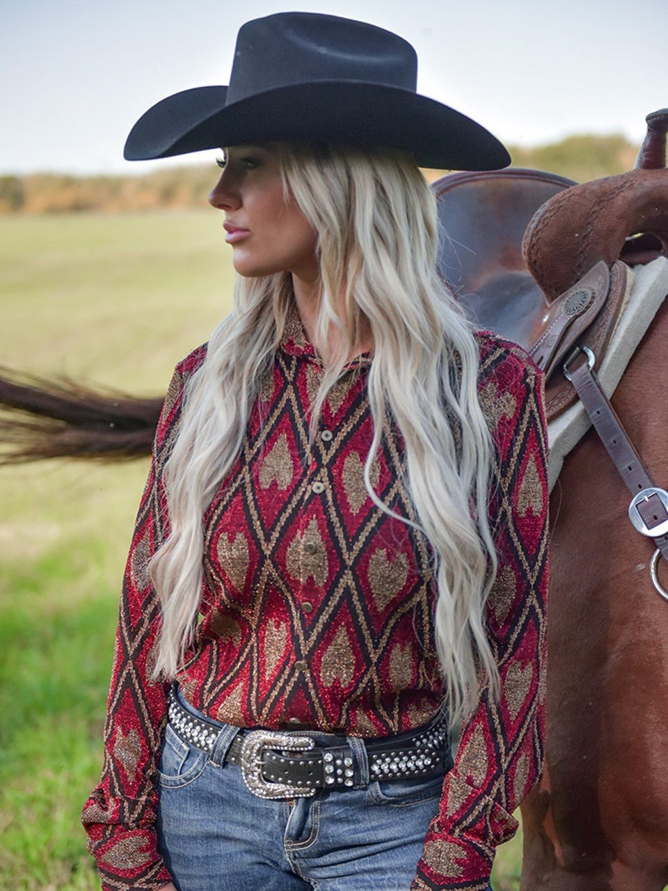 The print? Classic meets bold. Intricate diamond shapes in black and gold frame soft heart motifs in a way that feels both vintage and modern. The red backdrop keeps it rooted in western tradition, but that shimmer? All sass and style. It’s made to turn heads in the arena, on the dance floor, or at any event where your look needs to do the talking.