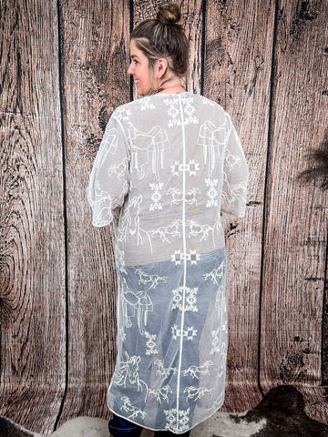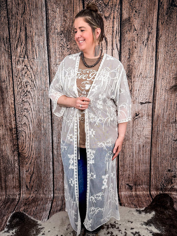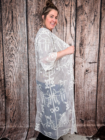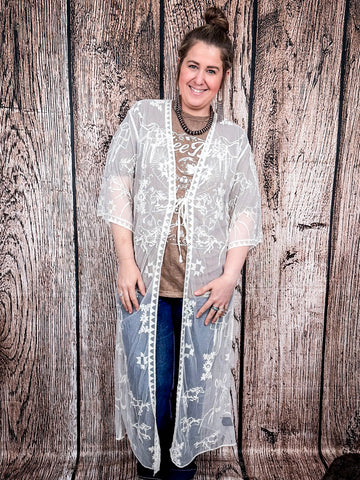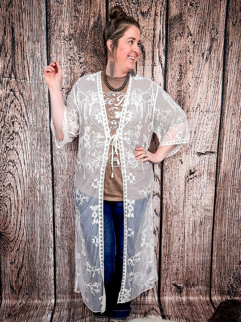 There’s something about a piece that speaks before you do—light as air, bold as the west, and full of quiet detail that catches the eye. The Stampede Embroidered Mesh Lace Duster by Lucky & Blessed is just that: a head-turner that whispers stories of open skies, dusty trails, and free-spirited grace.