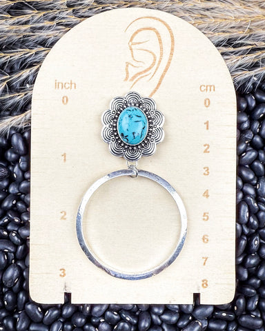 At the center of the design is a large, oval-shaped faux turquoise stone set into an intricately tooled silver concho. The setting features a floral, scalloped pattern reminiscent of traditional Western silversmithing, giving the earrings a touch of vintage charm and handcrafted character. The rich turquoise hue evokes the blue mesas and endless skies of the American Southwest. Itβs a color that tells a story of horizon lines, quiet strength, and the enduring beauty of earth and sky.