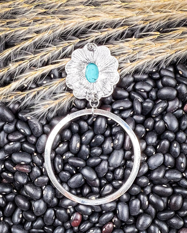 Beneath the concho, a wide circular hoop swings freely, creating movement and drama. The hoopβs gently hammered texture adds an organic feel, softening the silverβs shine and offering a sense of natural ruggedness. The contrast between the delicate floral detailing of the concho and the bold simplicity of the hoop strikes a perfect balance between heritage and modernity.