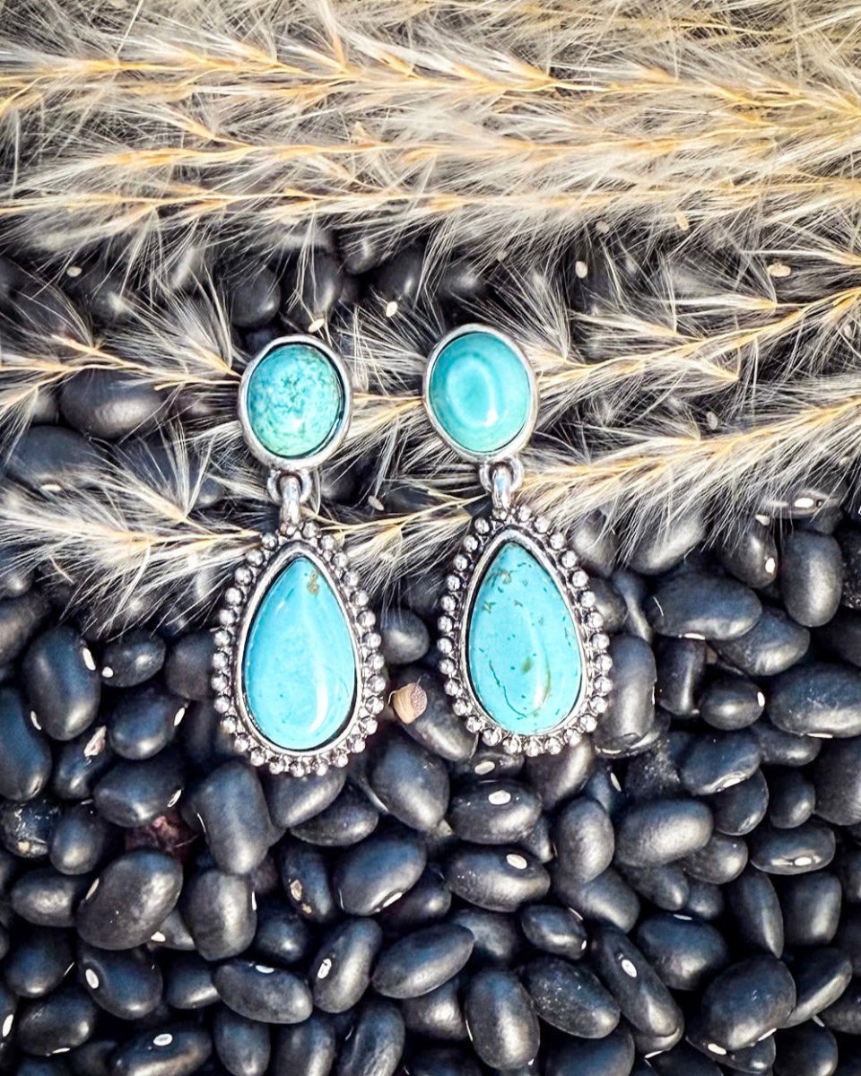 Designed with a round post top and a classic teardrop dangle, these earrings strike a perfect balance between boho spirit and Western glam. The faux turquoise stones feature natural marbling and unique coloring, giving them the look of authentic gemstones without the hefty price tag. A silver-tone beaded frame adds vintage character and texture, enhancing the natural stone's bold hue.