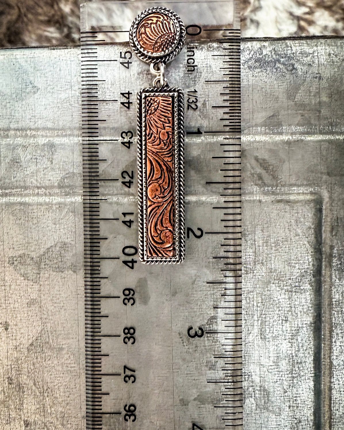 The softly antiqued copper finish highlights the scroll inspired detailing along the bar, creating depth and dimension without feeling overpowering. Though visually striking, these earrings remain lightweight and comfortable for all-day wear. Their warm tone pairs beautifully with denim, neutrals, soft earth tones, and layered looks, making them an easy addition to both casual and polished outfits.