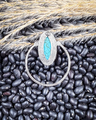 Suspended from each side of the stone is a large circular hoop made from hammered silver-toned metal. This open hoop gently curves outward, offering movement, balance, and a sense of spaciousness in the design. The lightly textured finish of the hoop softens the shine, giving the earrings an organic, timeworn feel that speaks to tradition and storytelling. The simplicity of the circle allows the central turquoise to shine while adding architectural structure to the silhouette.
