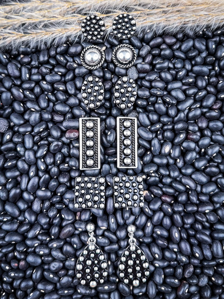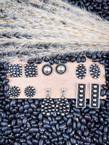 Each pair features an antiqued silver finish with raised bubble and concho-inspired details that bring texture, depth, and authenticity to your jewelry game. You’ll get a mix of shapes—squares, circles, ovals, rectangles, and even teardrop dangles—all designed to complement your western wardrobe, whether you’re rocking a graphic tee and jeans or dressing up for a night at the rodeo.