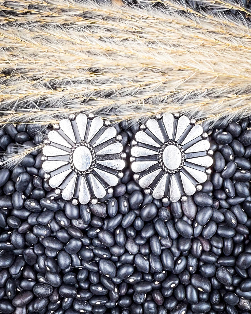 Measuring 1.5 inches across, these earrings are the perfect size to catch the light without stealing the show. The raised oval center is framed by rope-textured detailing, while the petal-shaped spokes add movement and depth. Every detail is carefully crafted to create a layered, dimensional look that feels both rustic and refined.