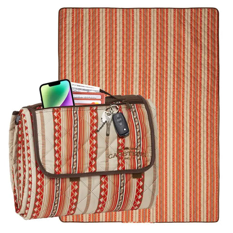 Whether you're camped out at the rodeo, settin’ up for a backyard cookout, or need a clean spot to sit by the trailer, the Chinlee Printed Stripe Picnic Blanket is made for western life on the move. With warm reds, sandy neutrals, and classic Southwest stripes, it’s got the kind of style that stands out without trying too hard.