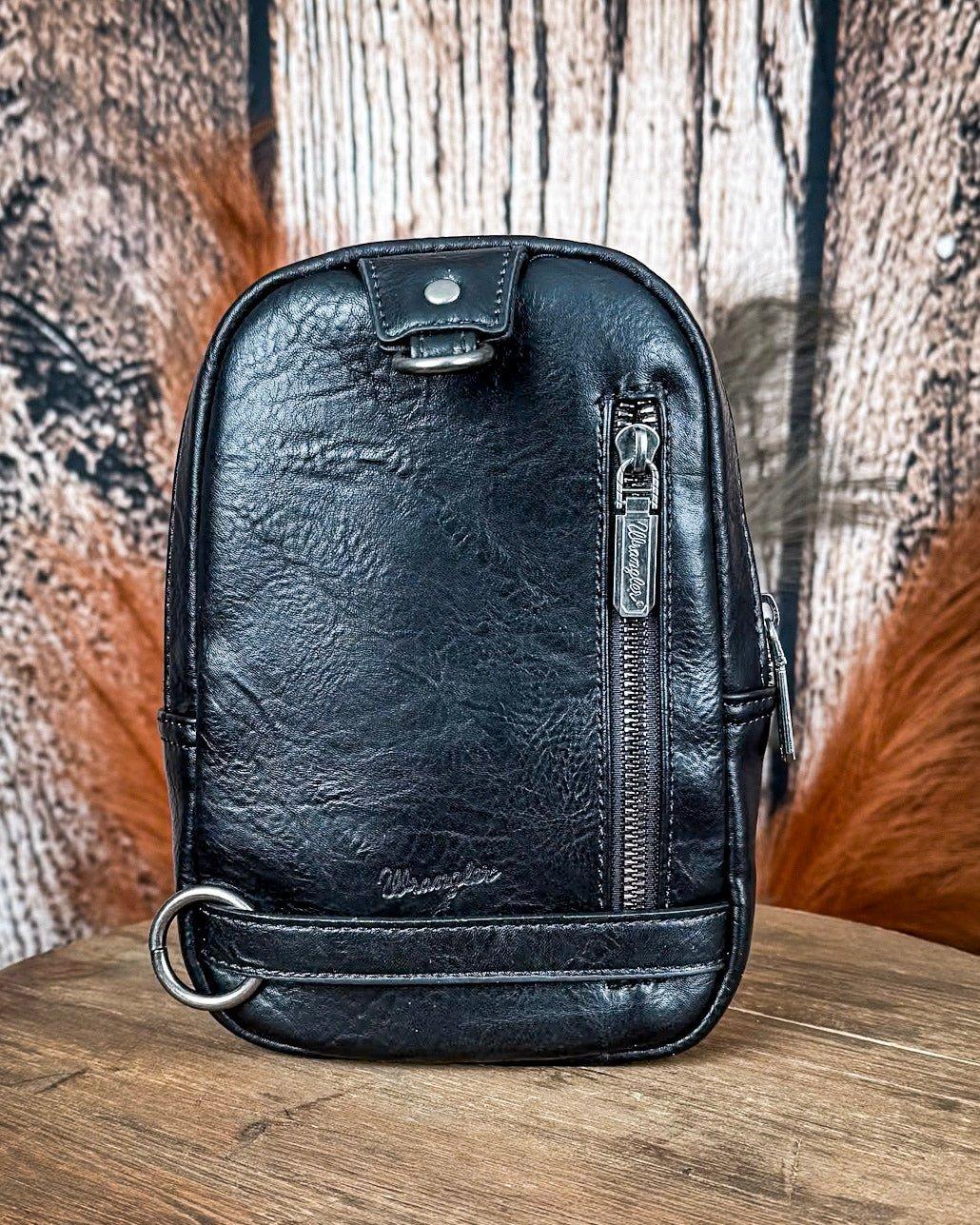 Carry a touch of the wild west wherever you go with the Magnolia Aztec Sling Bag in Black by Wrangler. This bold, compact design blends rugged western flair with everyday functionality. The front features a woven Aztec pattern in earthy tones against rich black vegan leather — a nod to the timeless spirit of the Southwest. Finished with an embossed Wrangler logo strap and multiple compartments, it’s the perfect hands-free bag for rodeos, concerts, or daily adventures.