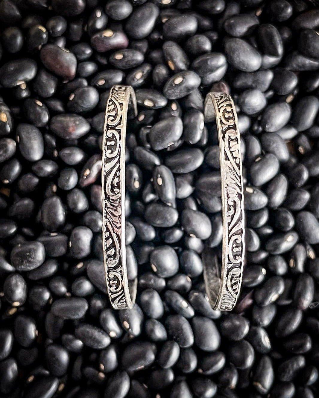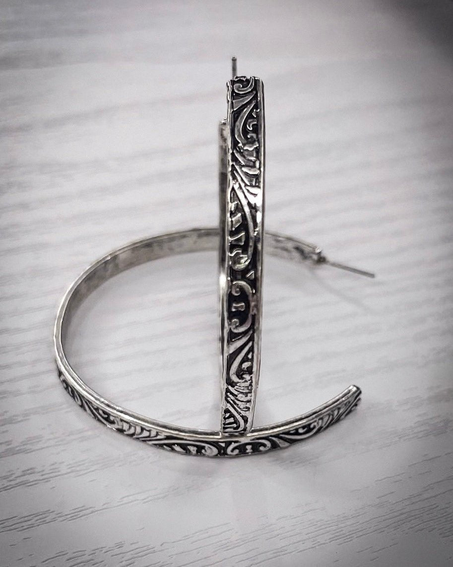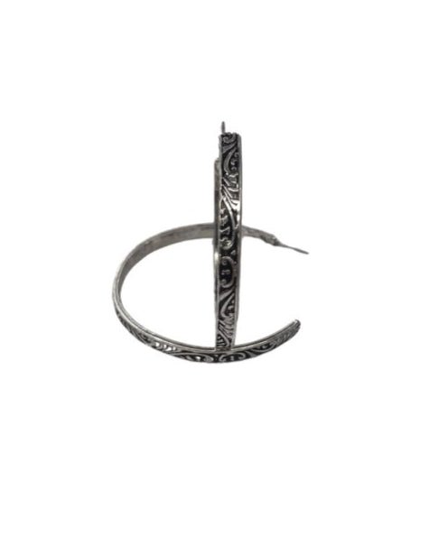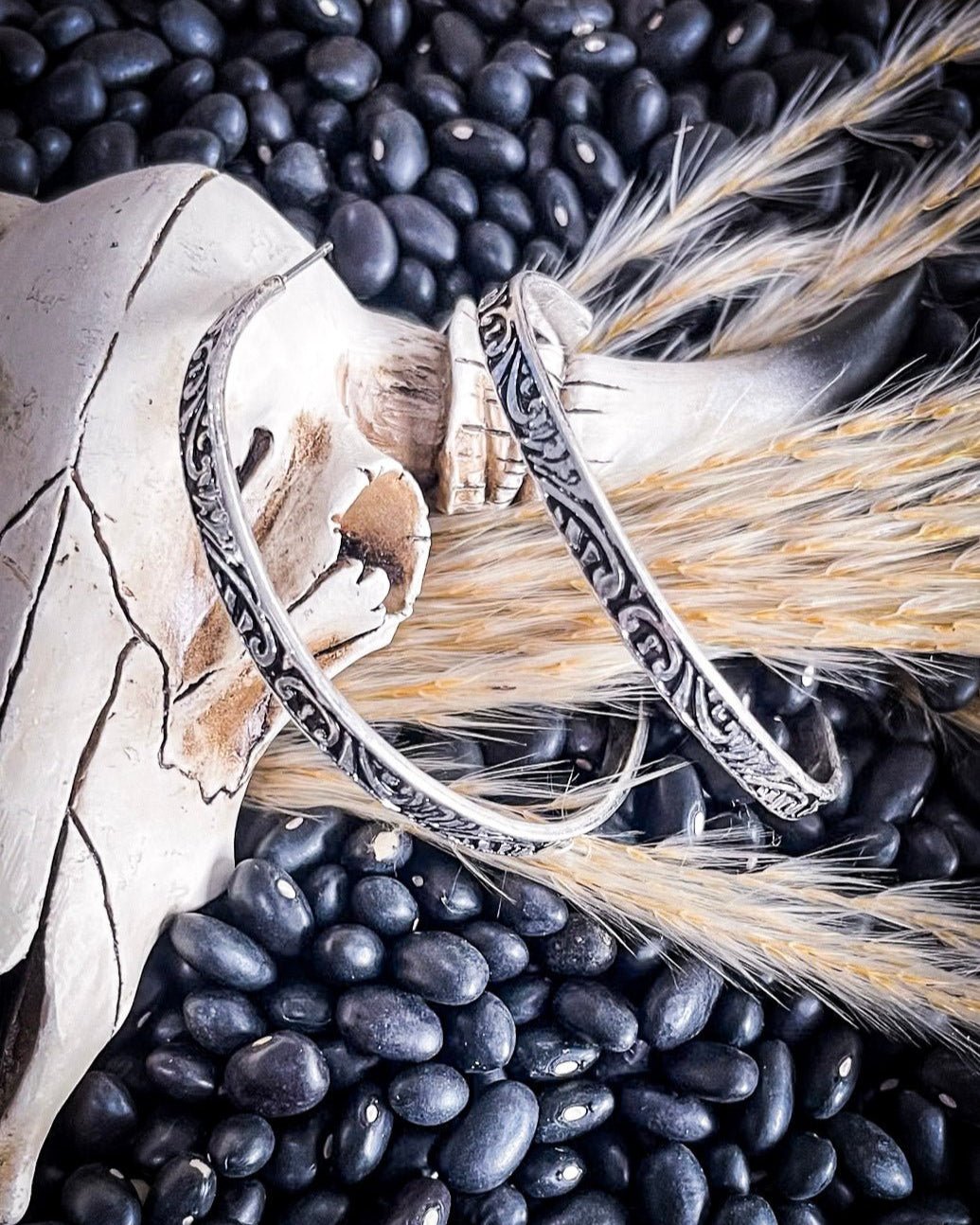 The Folk Tooled Hoop Earrings offer a refined interpretation of classic tooling, blending sculptural detail with a versatile silver-tone finish. Each medium-sized hoop features softly etched scrollwork reminiscent of hand-tooled patterns, creating depth and texture while keeping the overall silhouette clean and wearable. The antiqued finish enhances the detailing, giving the earrings a polished yet quietly expressive look.