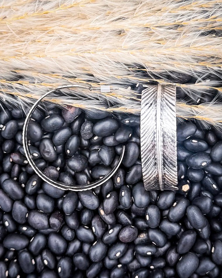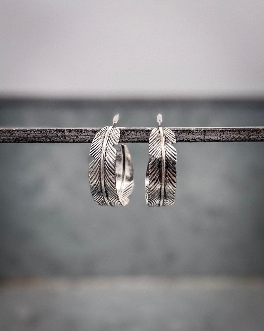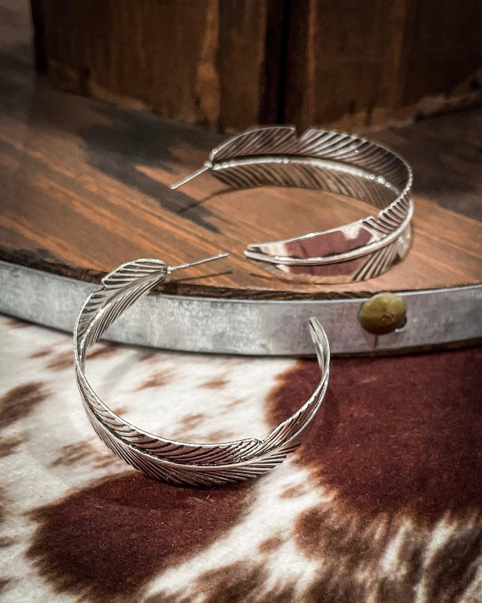 • Graceful, bold, and effortlessly western, the Hawk Feather Semi Hoop Earrings are a statement piece with soul. These fashion earrings are inspired by the power and symbolism of feathers — representing freedom, movement, and strength. Carefully crafted in a striking semi-hoop silhouette, each earring features intricately etched feather details that create a dynamic, layered look.