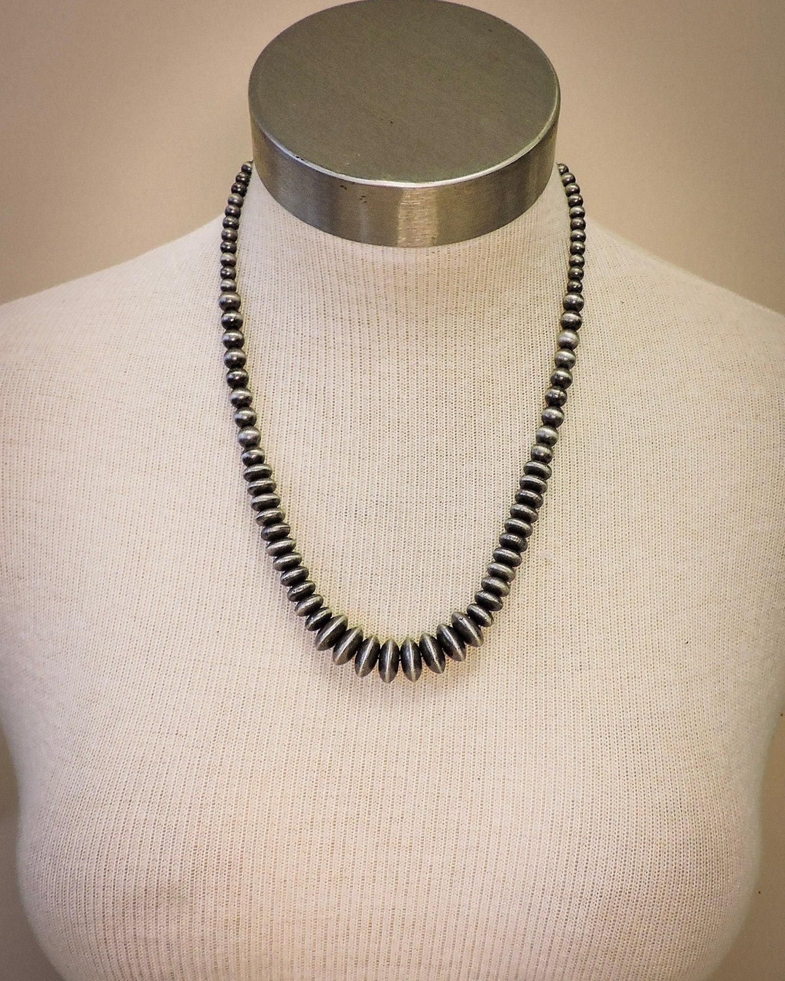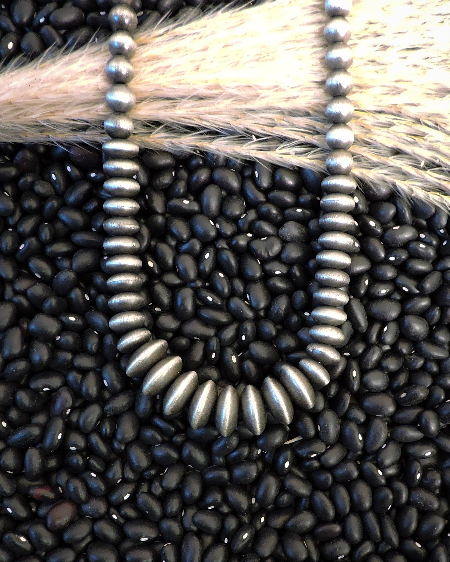 The necklace showcases a thoughtful arrangement of varying sizes, providing depth and texture that catch the light beautifully. Crafted from high-quality materials, it offers the look of authentic Navajo pearls while being lightweight and comfortable for all-day wear.