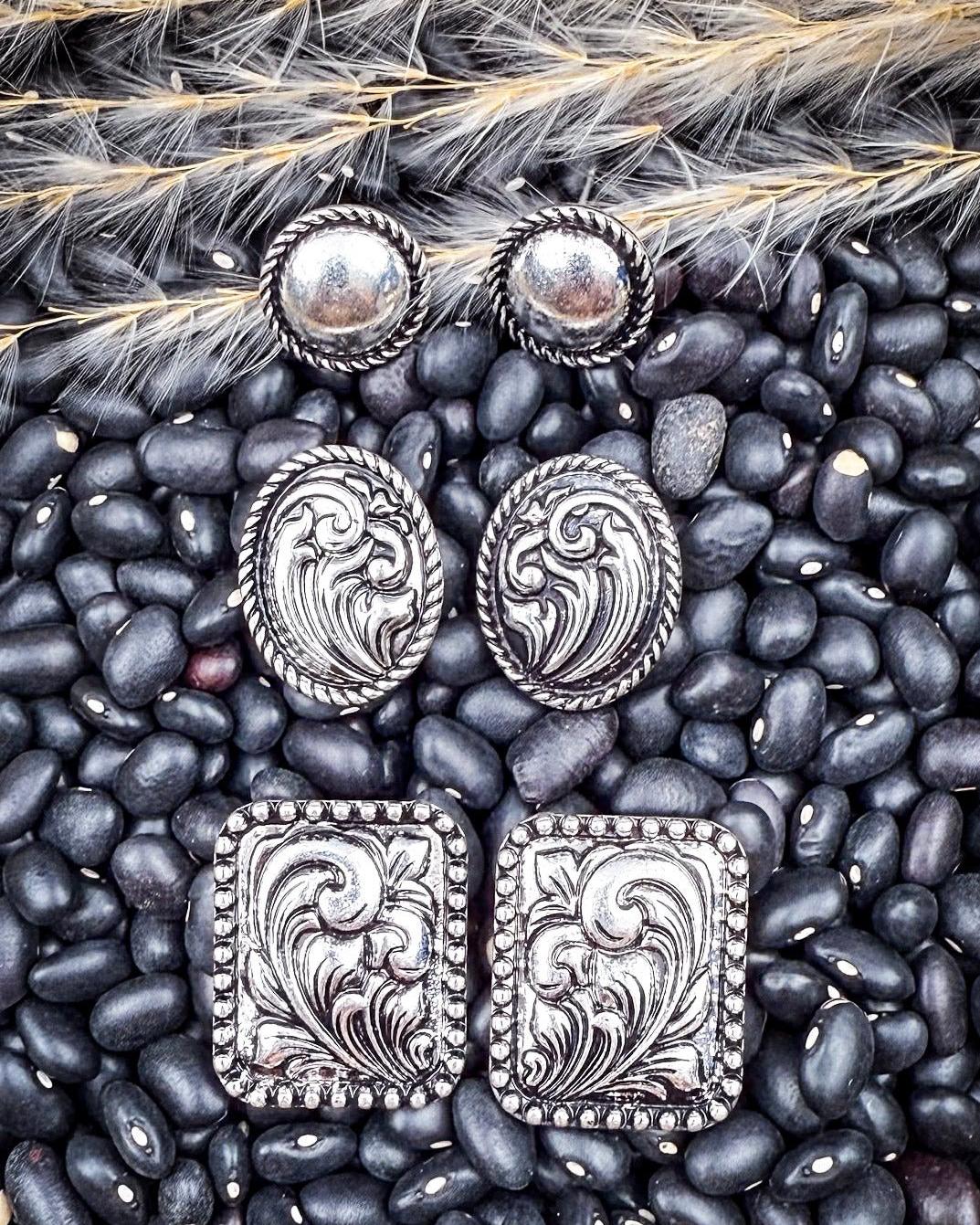 The final pair brings in boldness and structure—a rectangular concho-inspired design framed with a dotted silver border and finished with engraved western flourishes. This pair makes a statement while still being wearable for everyday.