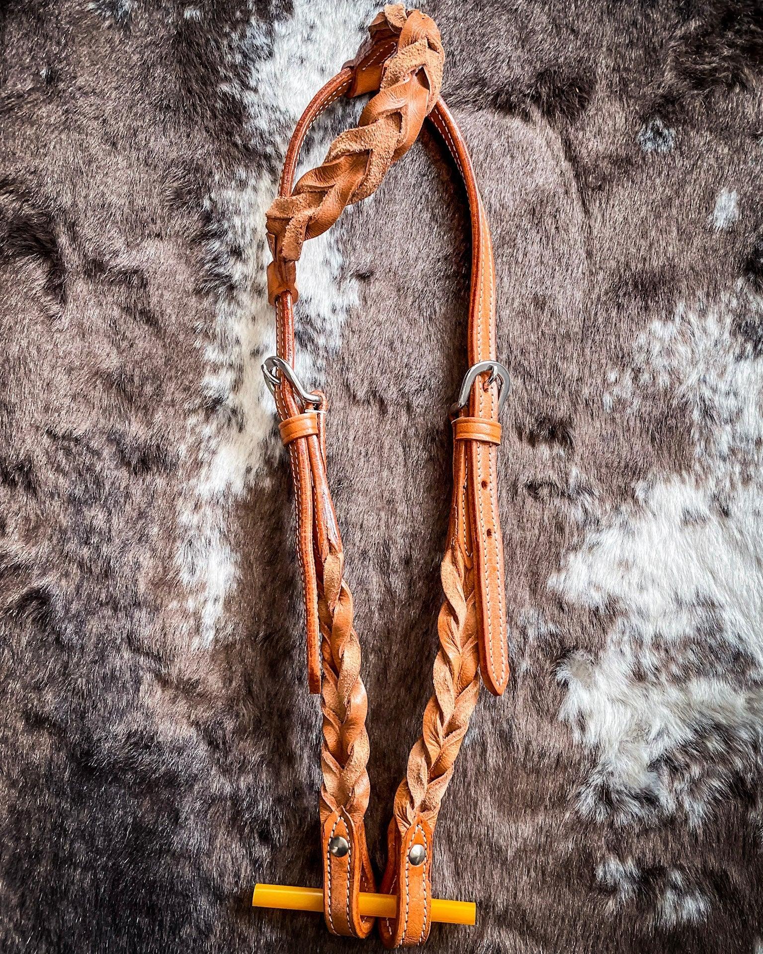 A twist on the old classic one ear headstall. Braided leather cheeks and ear, adjustable on both cheeks for a custom fit. Chicago screw bit ends.