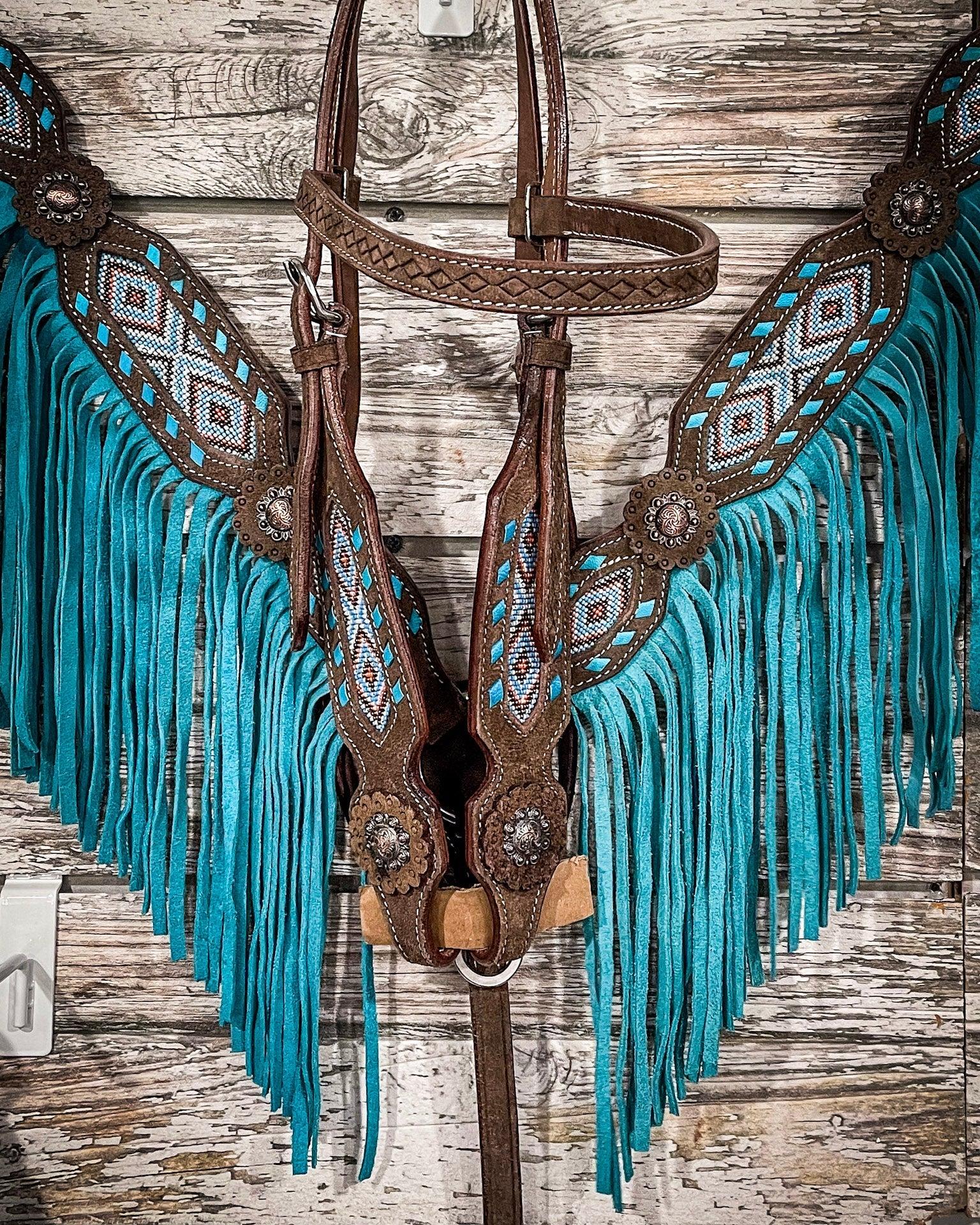 This dark roughout headstall features a bold, contrasting turquoise buckstitch edge and coral, white, bronze, and turquoise beading inlay. It features handsome copper concho accents at each screw bit end. Adjustable at the cheeks and throatlatch for the perfect fit.