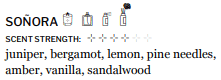 Notes of: juniper, bergamot, lemon, pine needles, amber, vanilla, sandalwood