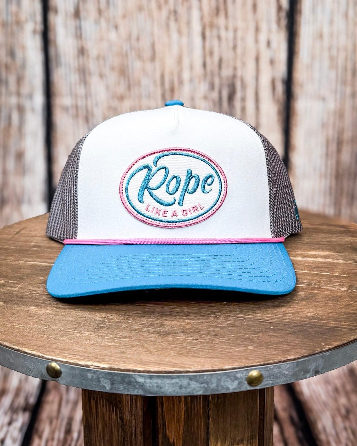 Up front, you’ve got a standout pink, turquoise, and white oval patch that proudly reads “Rope Like a Girl”—because we’re not just keepin’ up, we’re leadin’ the way. It’s stitched in with clean detail and pops against the white crown like a little badge of honor.