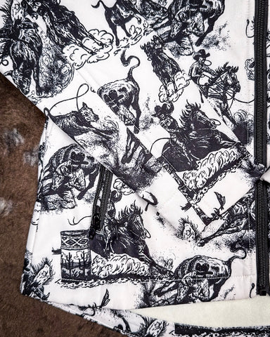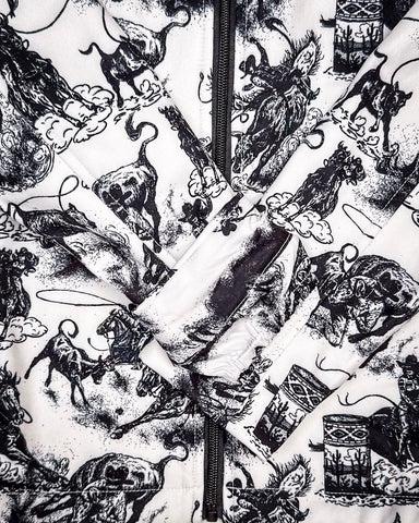 What truly sets this piece apart is its one-of-a-kind western print. Sketched in classic black-and-white ink style, the artwork features all the energy and drama of the rodeo, bucking broncs, daring riders, and hard-working cowboys. Every time you wear it, you carry a little piece of the arena with you.