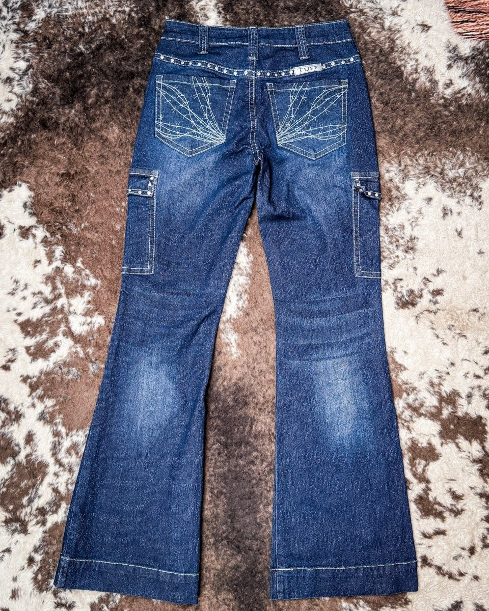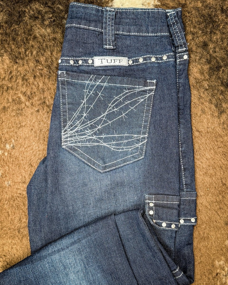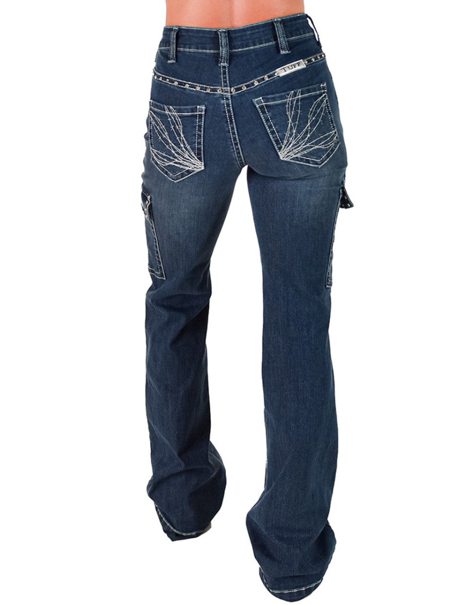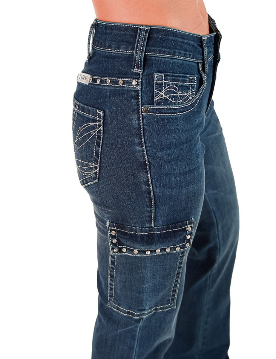 What truly sets these jeans apart is the stunning attention to detail—crystal rivet studs accent the back yoke and side cargo pockets for just the right amount of sparkle. Finished with bold silver stitching, these jeans pair effortlessly with anything from graphic tees to dressy blouses. Whether you're in the saddle or out on the town, these trousers deliver fashion, function, and a whole lot of wow factor.