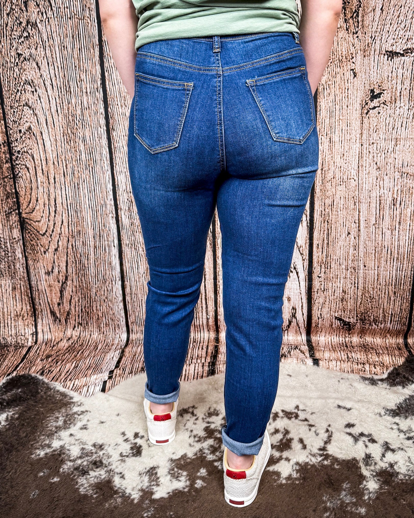 But it’s not just about how they look—it’s how they make you feel. These jeans are built for the long haul, offering a flattering stretch that recovers wear after wear. No bagging, no sagging—just reliable, curve-loving comfort that keeps its shape no matter where the day takes you. Whether you're two-stepping under string lights or grabbing coffee on the go, the Midnight Range Skinnies are your new go-to companion.