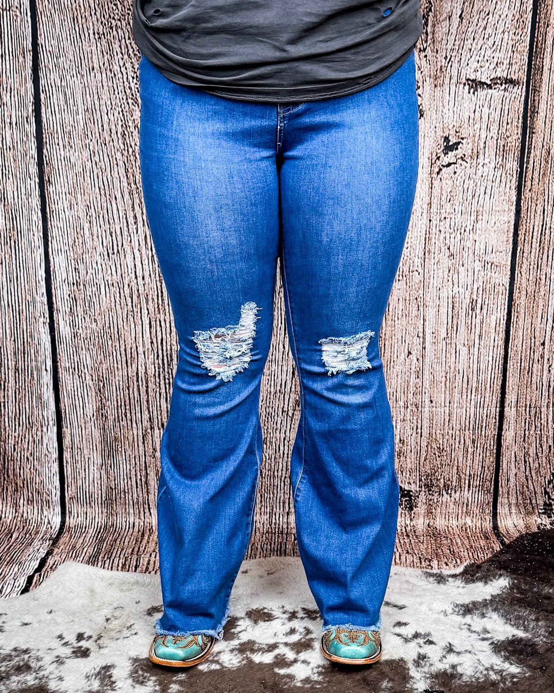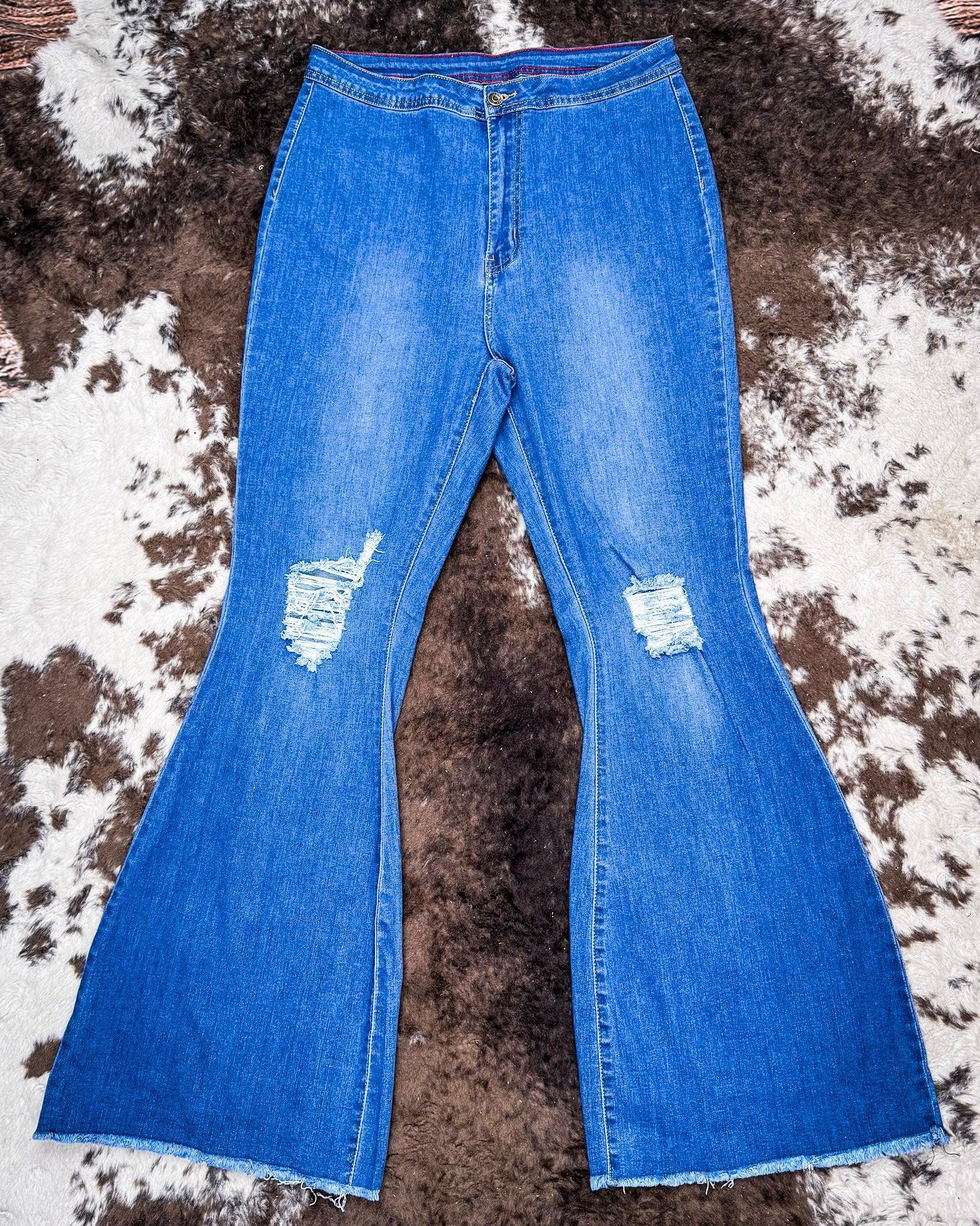 From the knee down, the leg opens into a dramatic flare that brings movement, confidence, and a dose of retro glamour to your step. The raw, frayed hemline adds a final flourish of texture, reinforcing the laid-back vibe that defines this modern classic. This flare style pairs effortlessly with chunky heels, platform boots, or even sleek pointed-toe shoes, making it a versatile addition to your denim rotation.