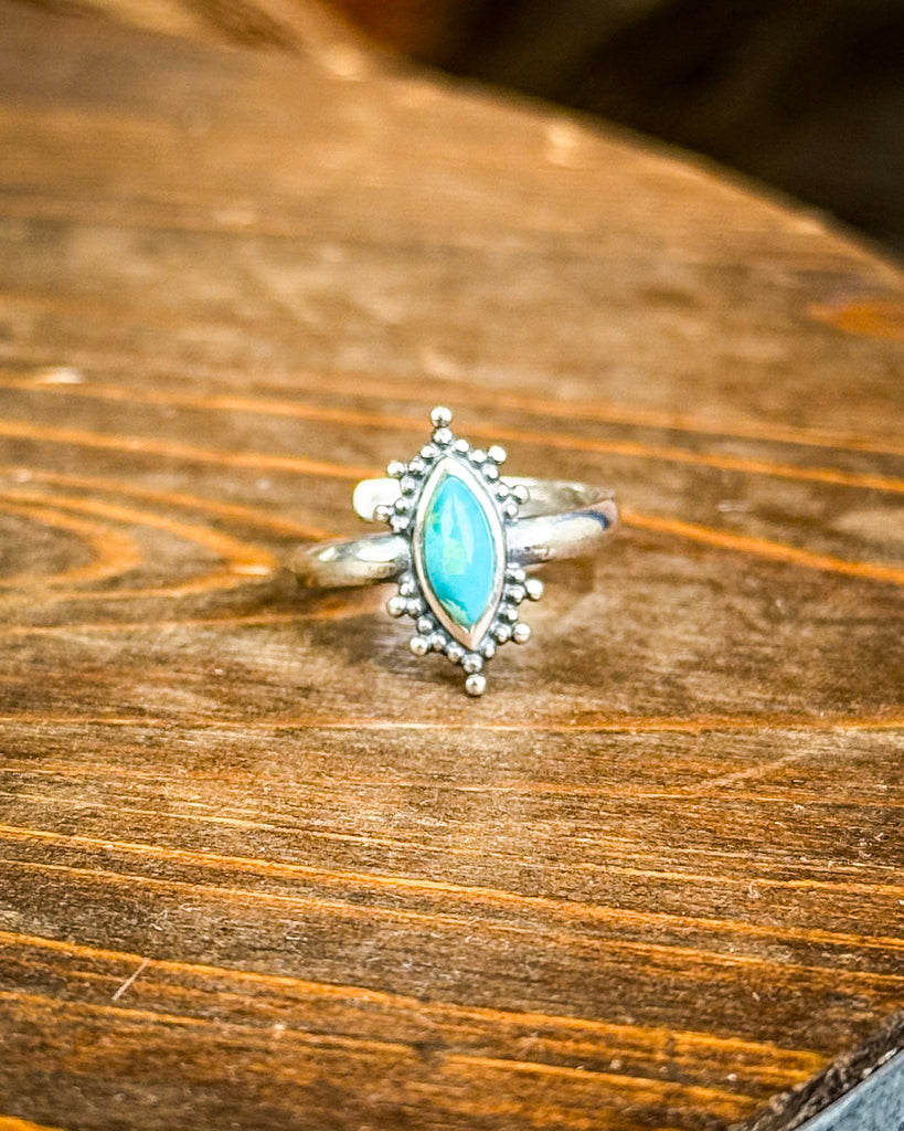 Elegant with a touch of western soul, the Kal Adjustable Genuine Turquoise Ring is a timeless piece designed to move with your style. Crafted from solid 925 sterling silver, it features a marquise-cut turquoise stone framed by delicate silver bead detailing. The unique shape draws the eye, making it a standout design while still being versatile enough for everyday wear.