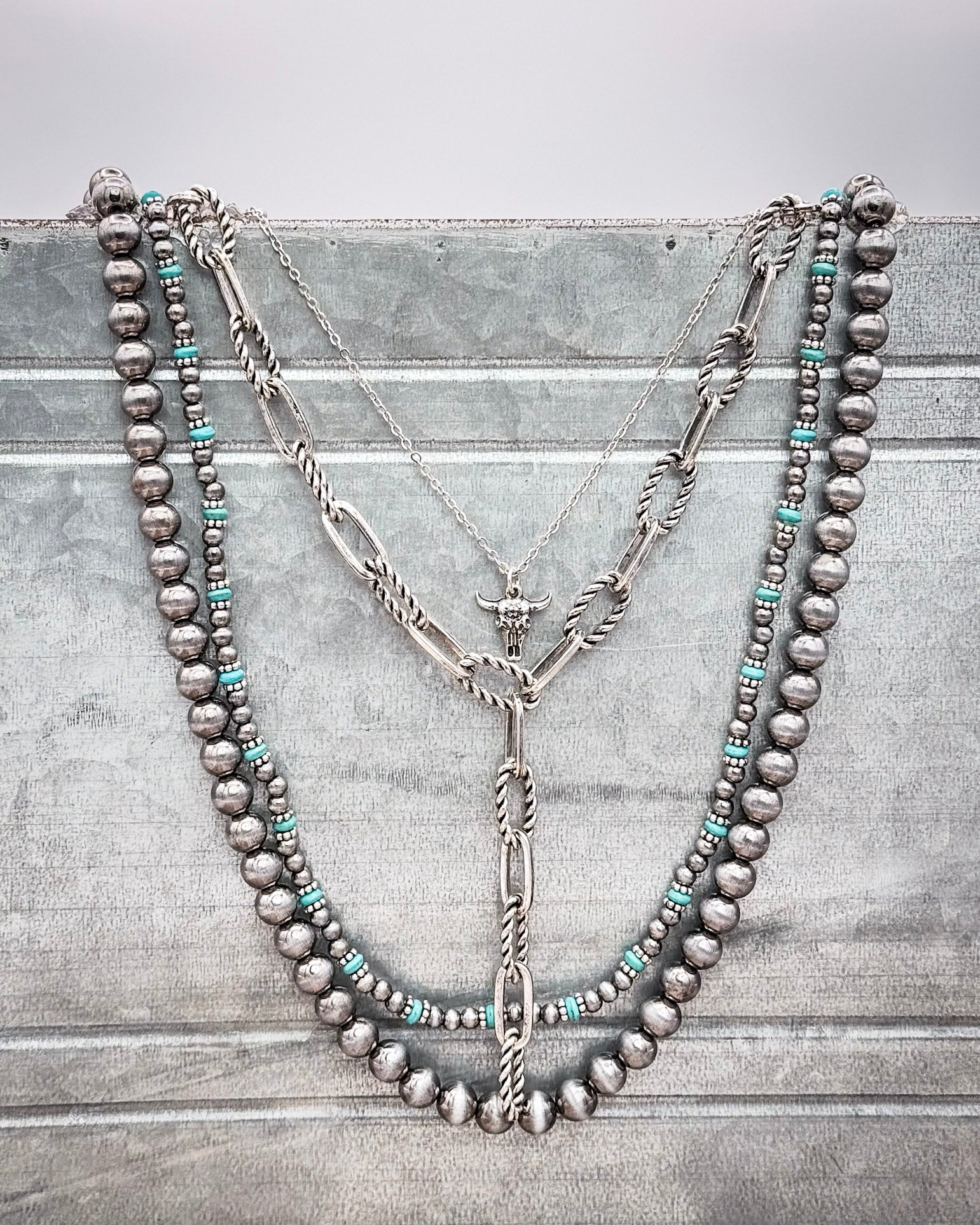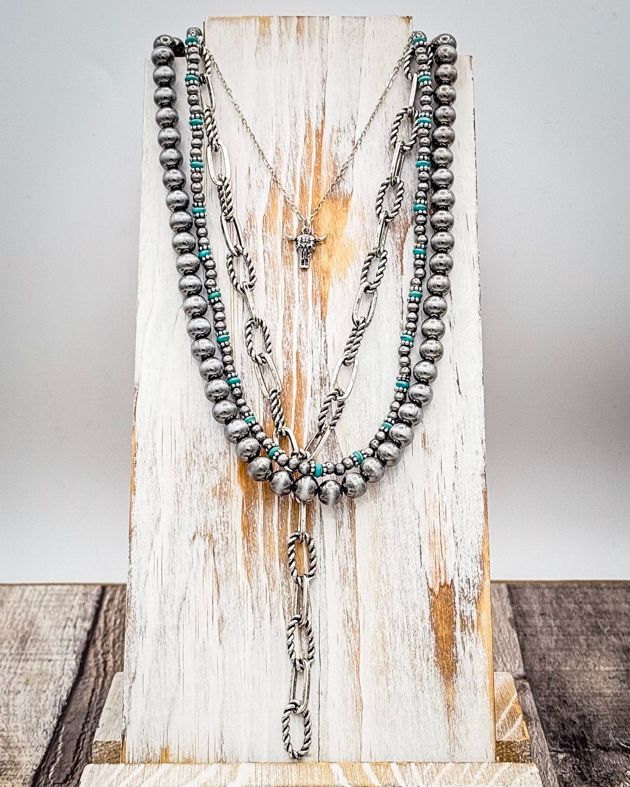 Bring bold western charm to your look with the Dust Walker Layered Fashion Necklace Set. Featuring a mix of Navajo pearl–inspired beads and modern silver toned chain links, this necklace set layers effortlessly to create a statement that’s both rugged and refined.