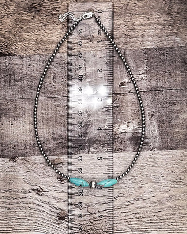 This 15-inch choker is built around 3mm 0.925 sterling silver pearls, finished with a bold center: one 10mm sterling silver saucer bead, flanked by two real turquoise torpedo beads. That pop of blue? Pure magic. Every turquoise bead is naturally different—so no two pieces will ever be exactly the same. Some run a little deeper in color, some a little lighter, but all of ’em have that earthy, genuine feel you can’t fake.