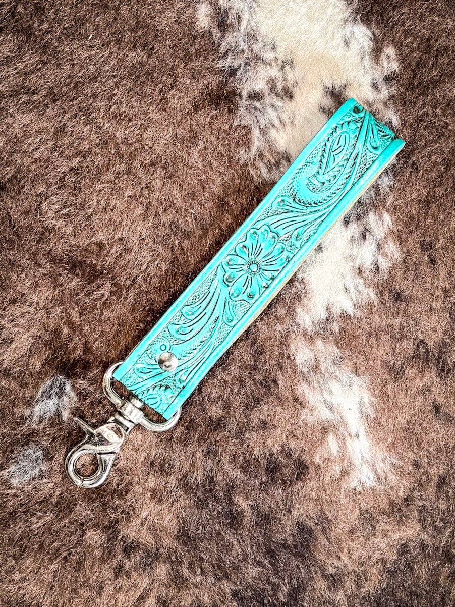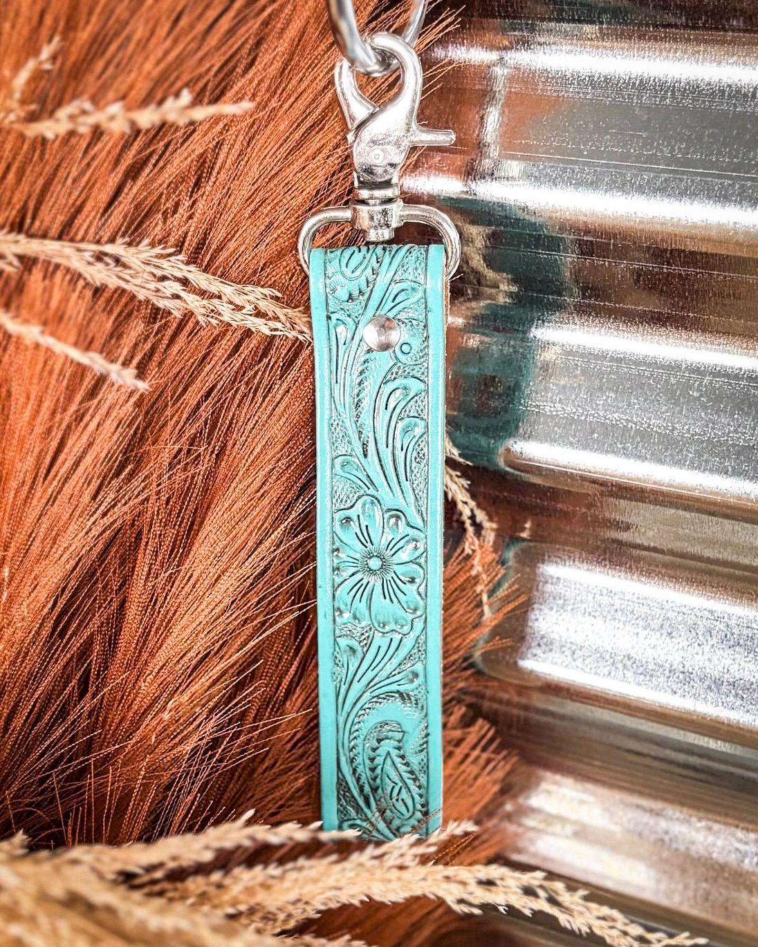 Add a touch of western charm to your everyday essentials with the Blooming Meadows Key Fob. This stunning key fob features hand-tooled leather in a vibrant turquoise hue, showcasing intricate craftsmanship and timeless design.