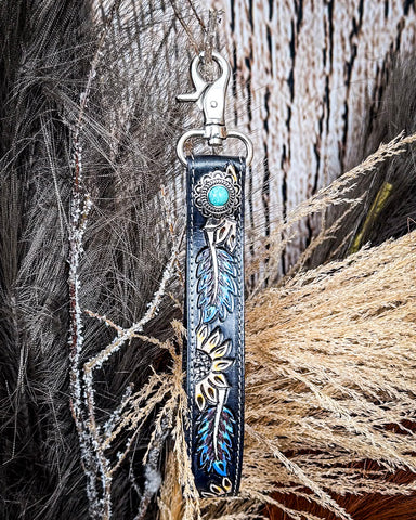 Handcrafted from full-grain leather, the Cheyenne Bloom Key Fob stands out with its hand-tooled floral design. Bursting with energy and color, the tooled surface features detailed sunflowers and foliage in rich tones of golden yellow, turquoise blue, and soft green. The flowers are outlined with precision and care, each petal and leaf etched into the leather with traditional tooling techniques passed down through generations. The contrast between the vivid designs and the deep black leather background creates a stunning visual impact thatβs both rustic and refined.