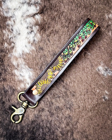 Made from genuine leather, this key fob features intricate hand-tooling that tells a story of rustic charm and artistic expression. The design showcases radiant golden sunflowers entwined with vibrant green cacti, creating a lively contrast against the warm, chocolate-brown leather backdrop. Each bloom and swirl is carefully carved and colored, offering a piece that feels personal, timeless, and rooted in nature’s raw beauty.