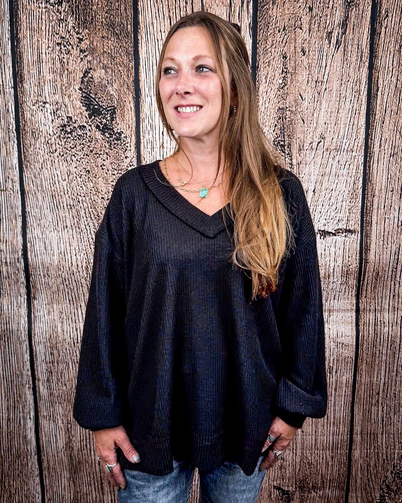 Not your average basic. The Hadley Top in Black brings a little something extra to your everyday wardrobe. With its flattering v neckline, banded trim, and soft ribbed knit, it’s made to feel comfortable while looking effortlessly put together. Think of it as your new go-to—easy to style, easy to wear, and anything but boring.