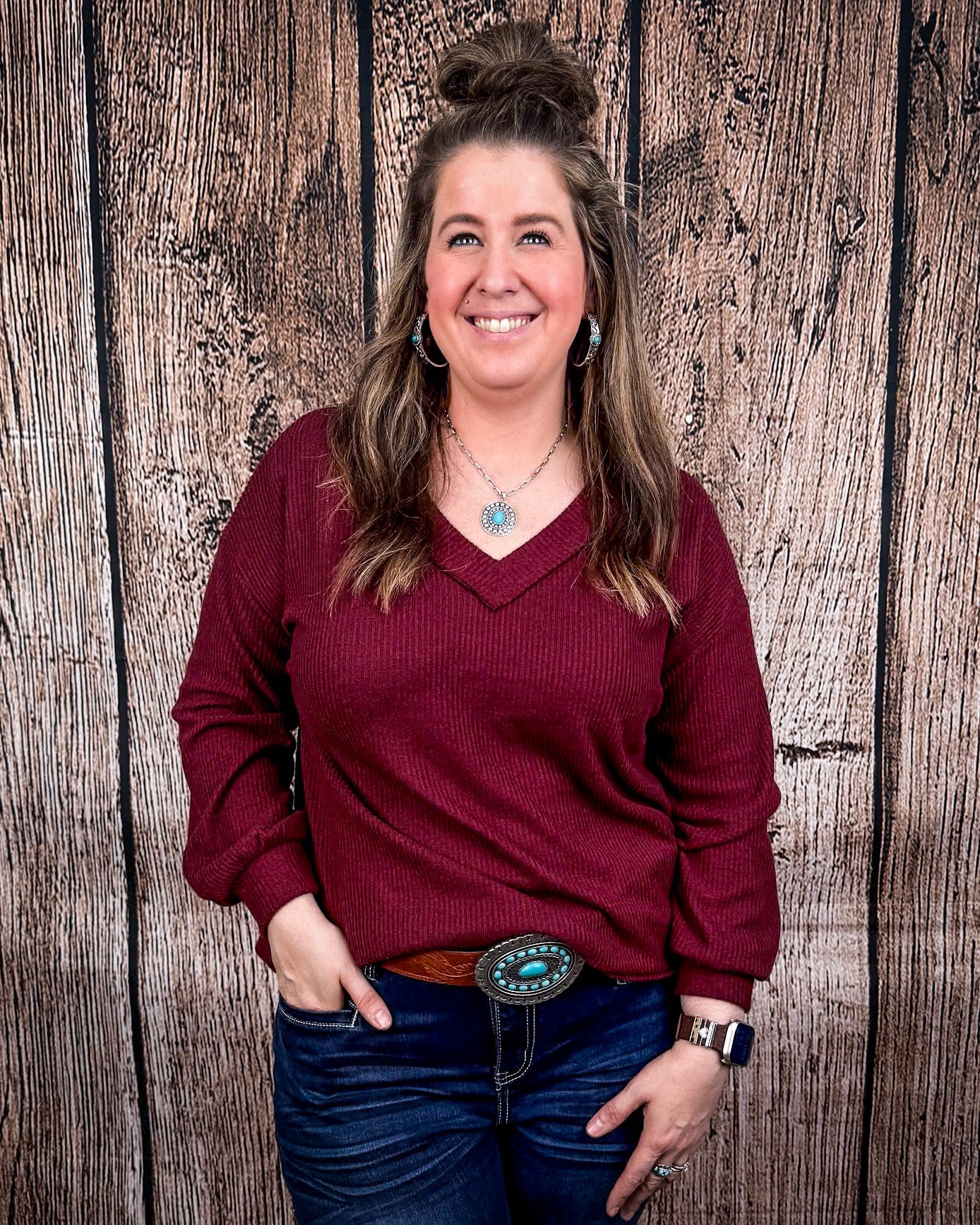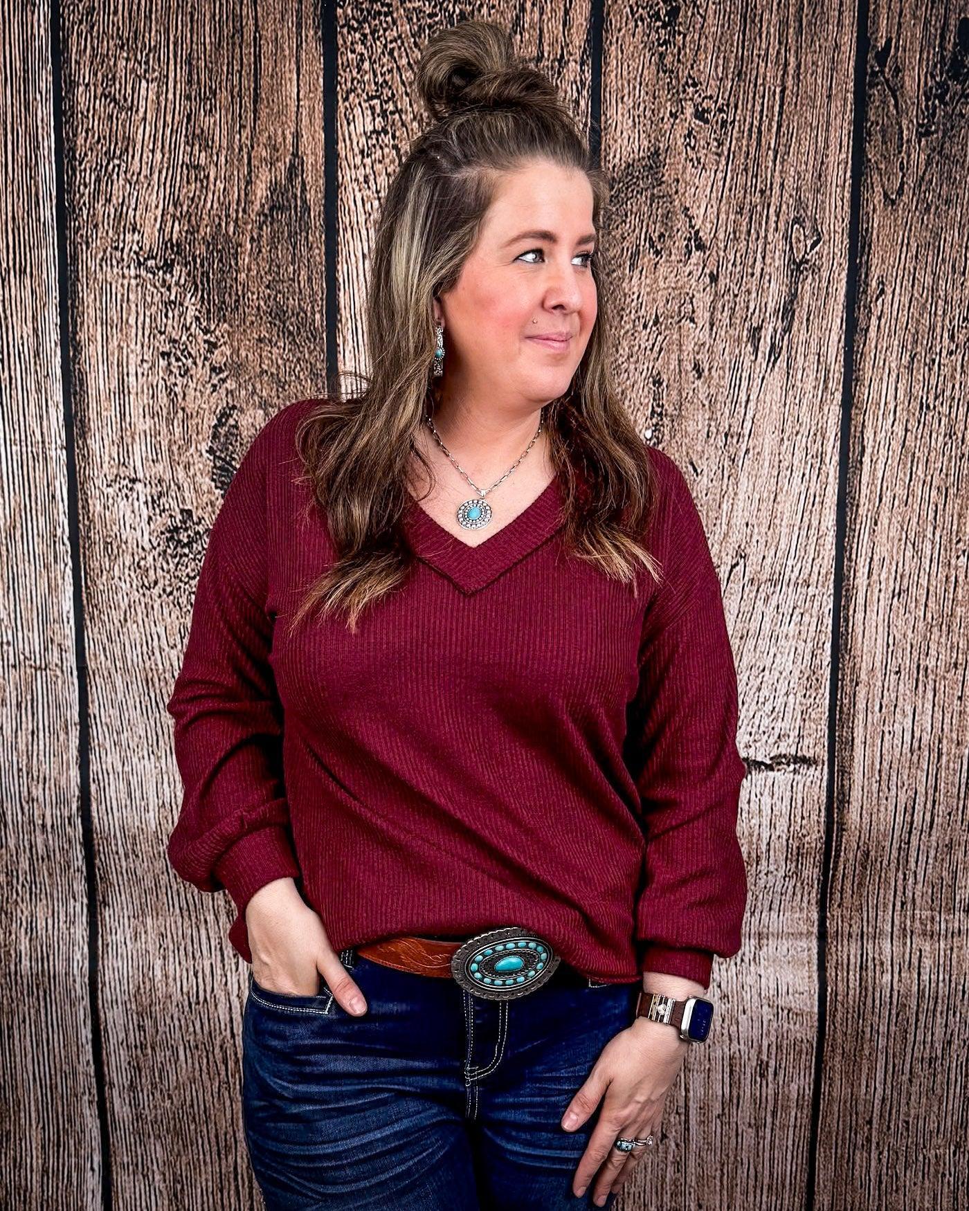 The ribbed texture gives this top just enough dimension to stand out, and the banded hem, sleeves, and neckline keep it looking structured without feeling stiff. The v neckline is a standout feature—feminine, flattering, and perfect for layering with your favorite turquoise or silver statement jewelry.