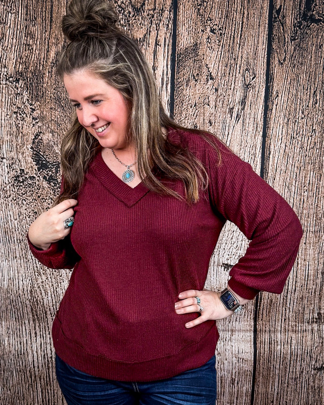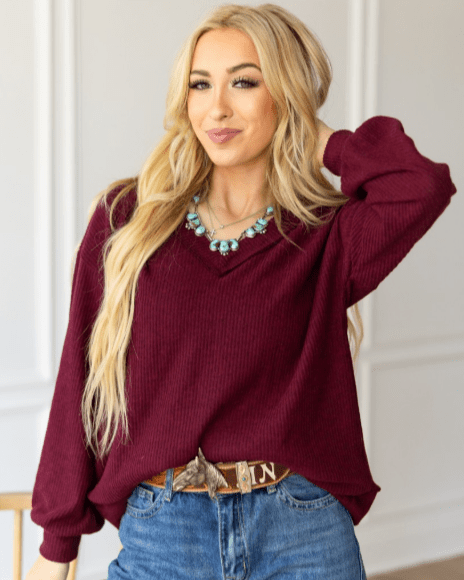 This Wine colorway brings warmth and depth to the piece, making it a go-to for fall, winter, and well into spring. It's bold enough to feel like a statement, but still neutral enough to pair with all your favorite denim and boots. Whether you’re headed to dinner, a casual get-together, or just throwing something on for the day, The Hadley Top in Wine adds just the right amount of color to your look.