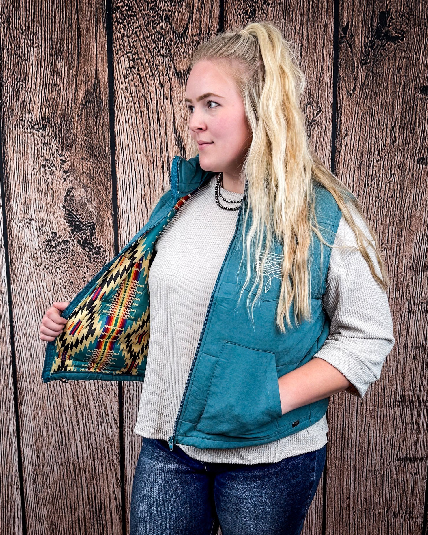 Inside, you’ll find a pop of Aztec-printed lining that adds a surprise dose of style every time you unzip. The subtle boot stitch embroidery on the front and back gives it that extra nod to Western heritage we love. And with roomy side pockets and a cozy stand-up collar, it's made for throwing on and heading out—whether you're headed to the barn or town.