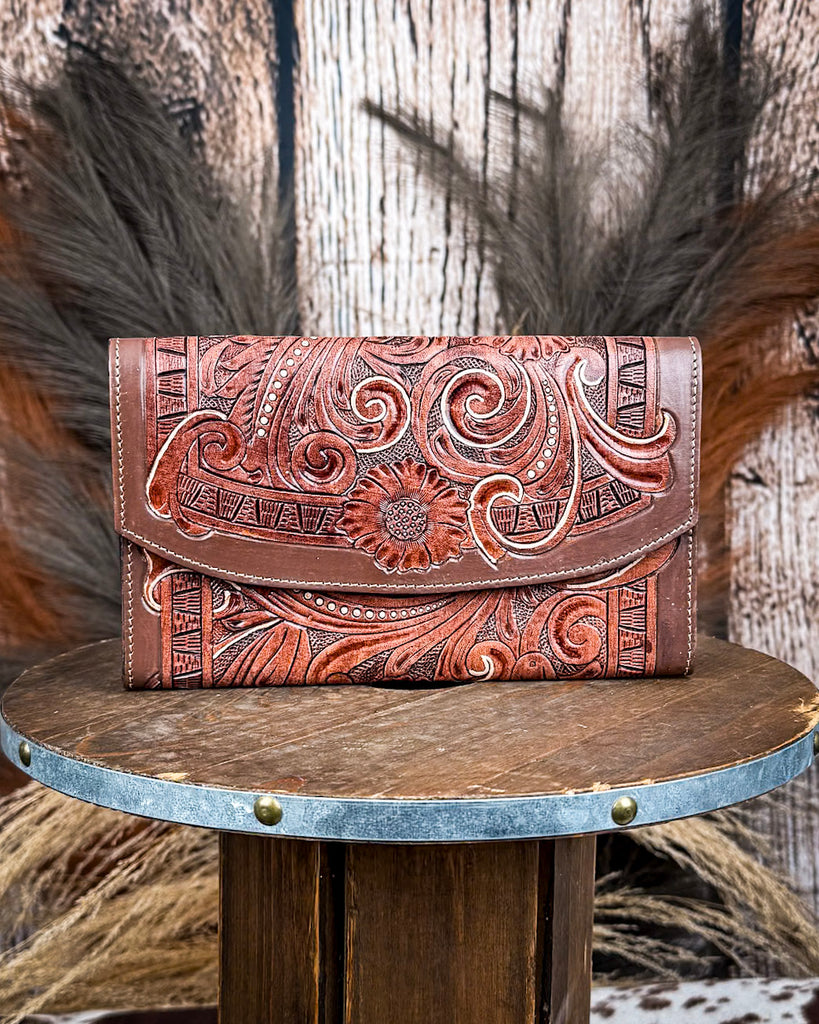 The front panel showcases an intricate hand-tooled design inspired by classic western scrollwork, complete with swirling floral patterns and fine textures that reflect the skilled artistry behind every Myra creation. Made from heavy-duty genuine leather in warm, earthy brown tones, the Atrospect wallet makes a bold yet refined statement that suits both rugged cowgirls and elegant Western enthusiasts.