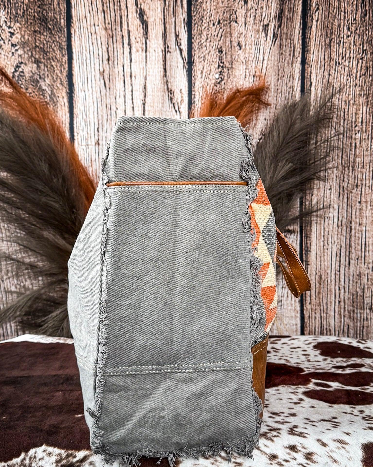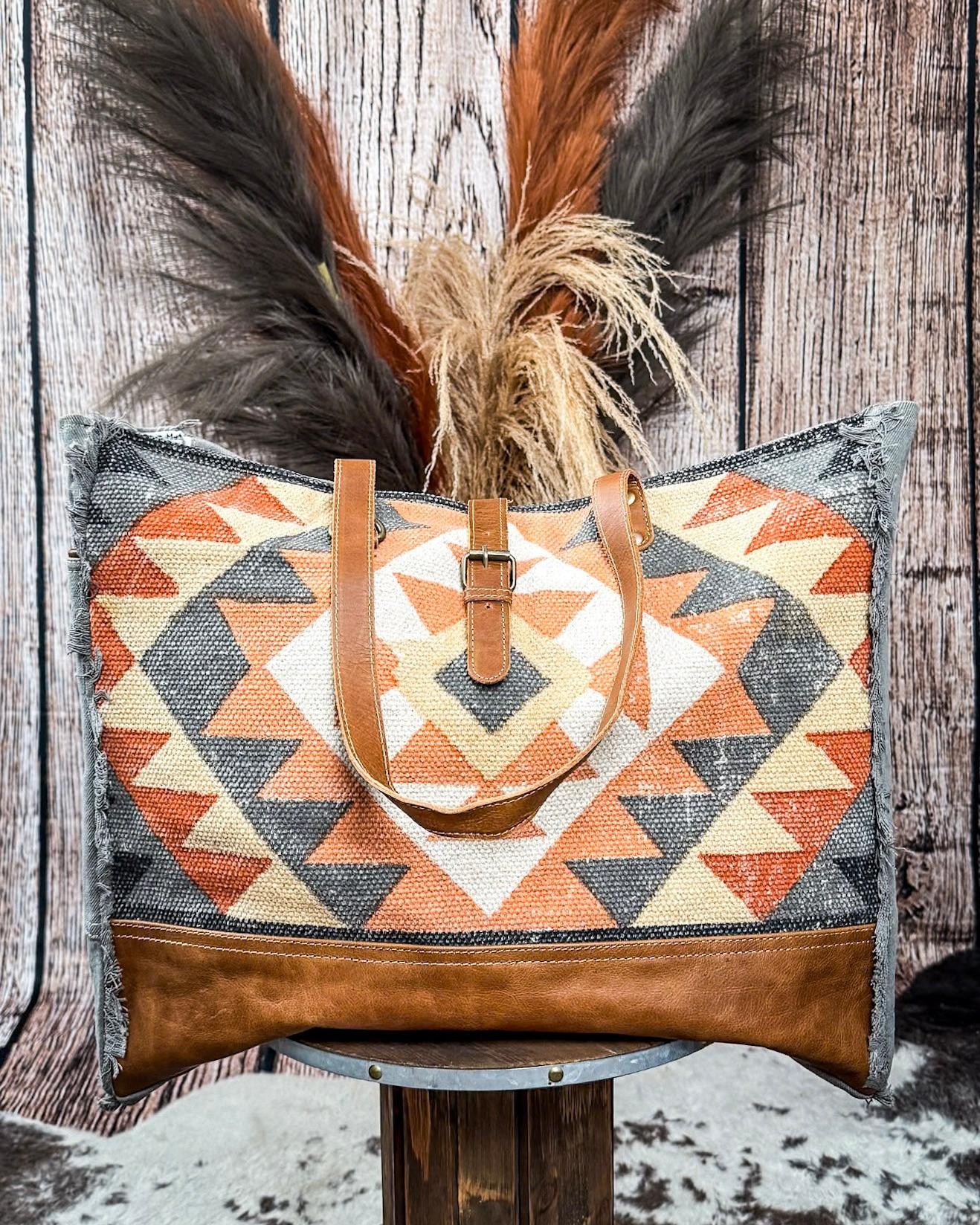 The front panel features a vibrant geometric rug design in warm desert tones—terracotta, sandstone, and soft charcoal—all woven into a pattern that’s equal parts heritage and high style. It’s accented by genuine leather detailing and a solid leather base for durability that stands up to the long haul.